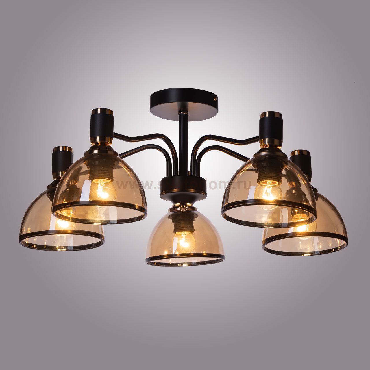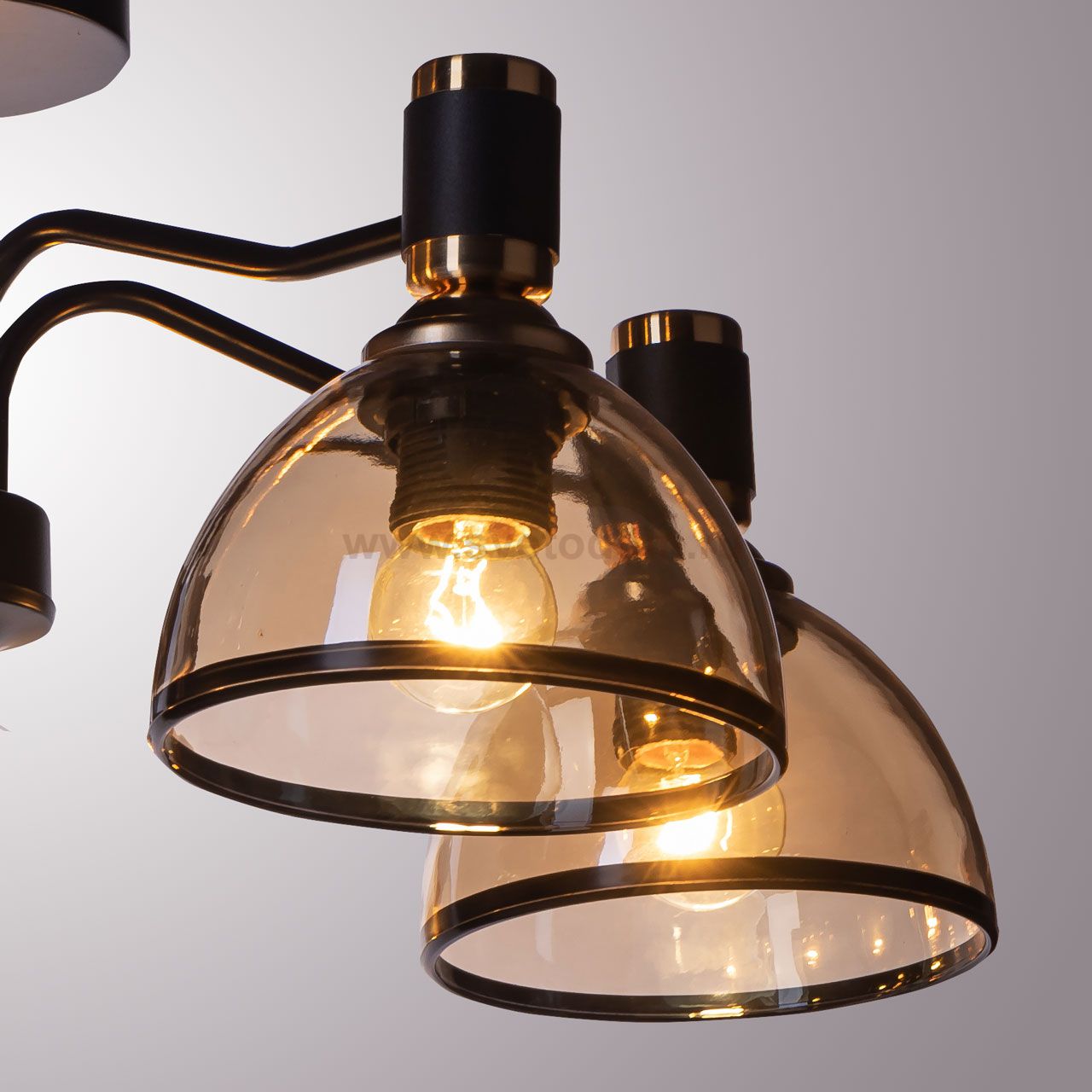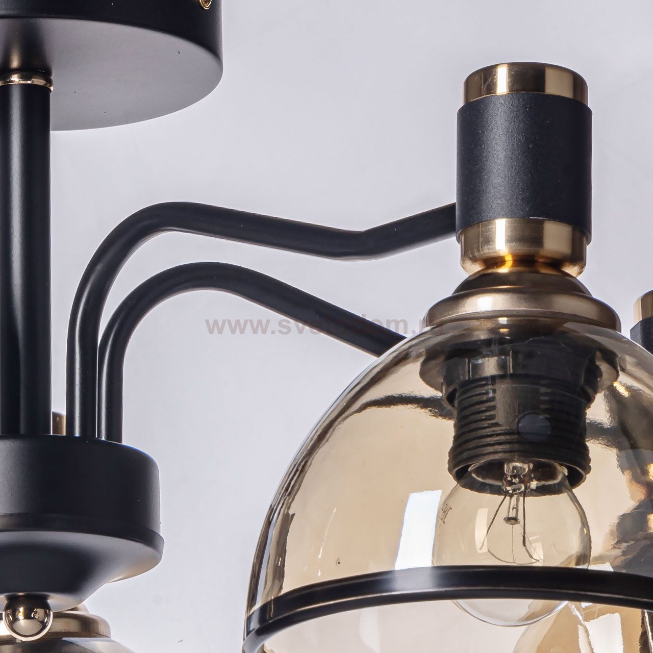 Металлическое основание потолочной люстры окрашено в черный цвет. Отдельные элементы основания гальванизированы в цвет золота. Потолочная люстра декорирована стеклянными плафонами, гальванизированными в цвет коньяк. Плафоны отделаны металлическим кантом черного цвета. Комментарий