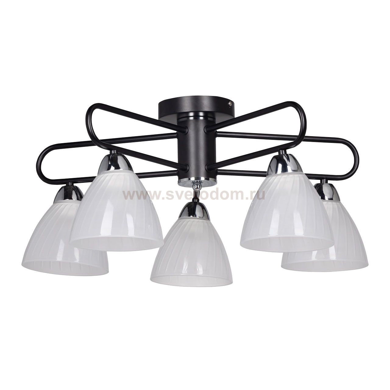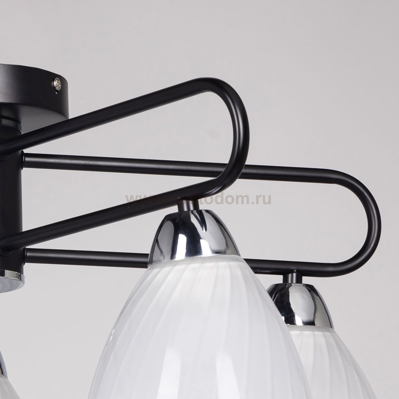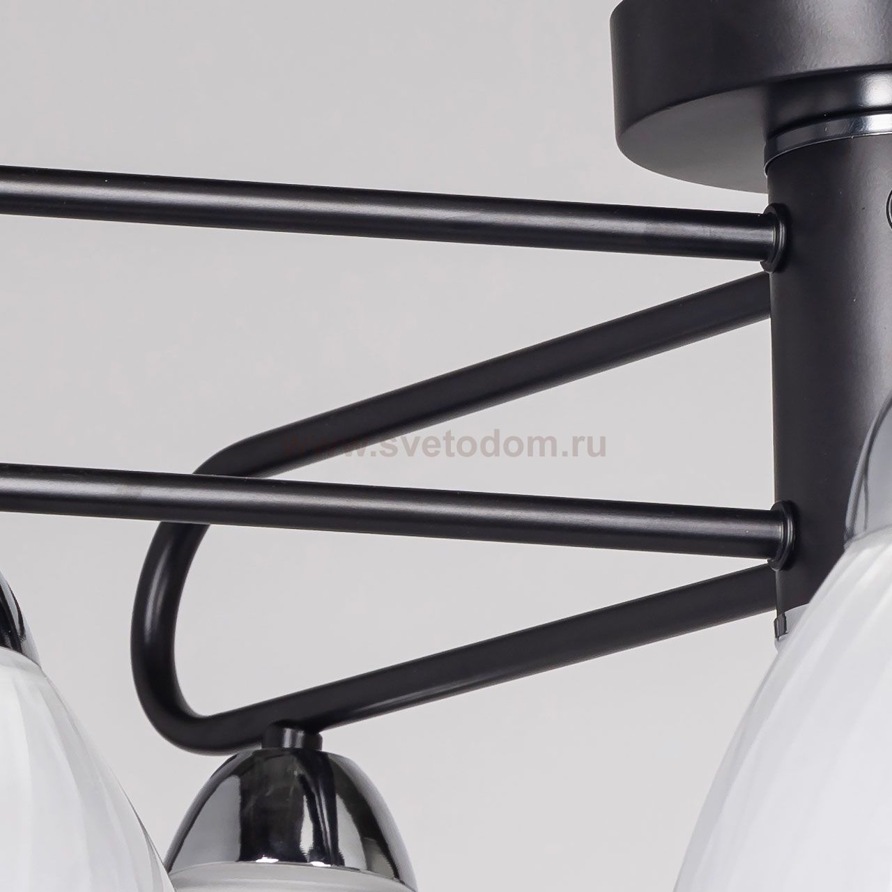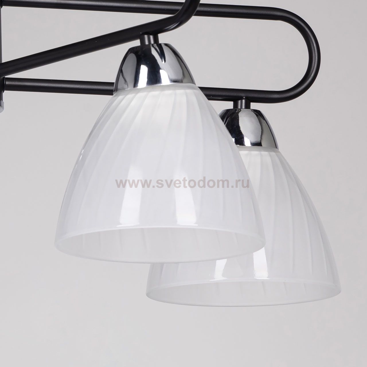Металлическое основание потолочной люстры окрашено в черный цвет. Отдельные элементы основания гальванизированы в цвет хрома. Потолочная люстра декорирована стеклянными плафонами, отлитыми в сложную форму и матированными. Комментарий