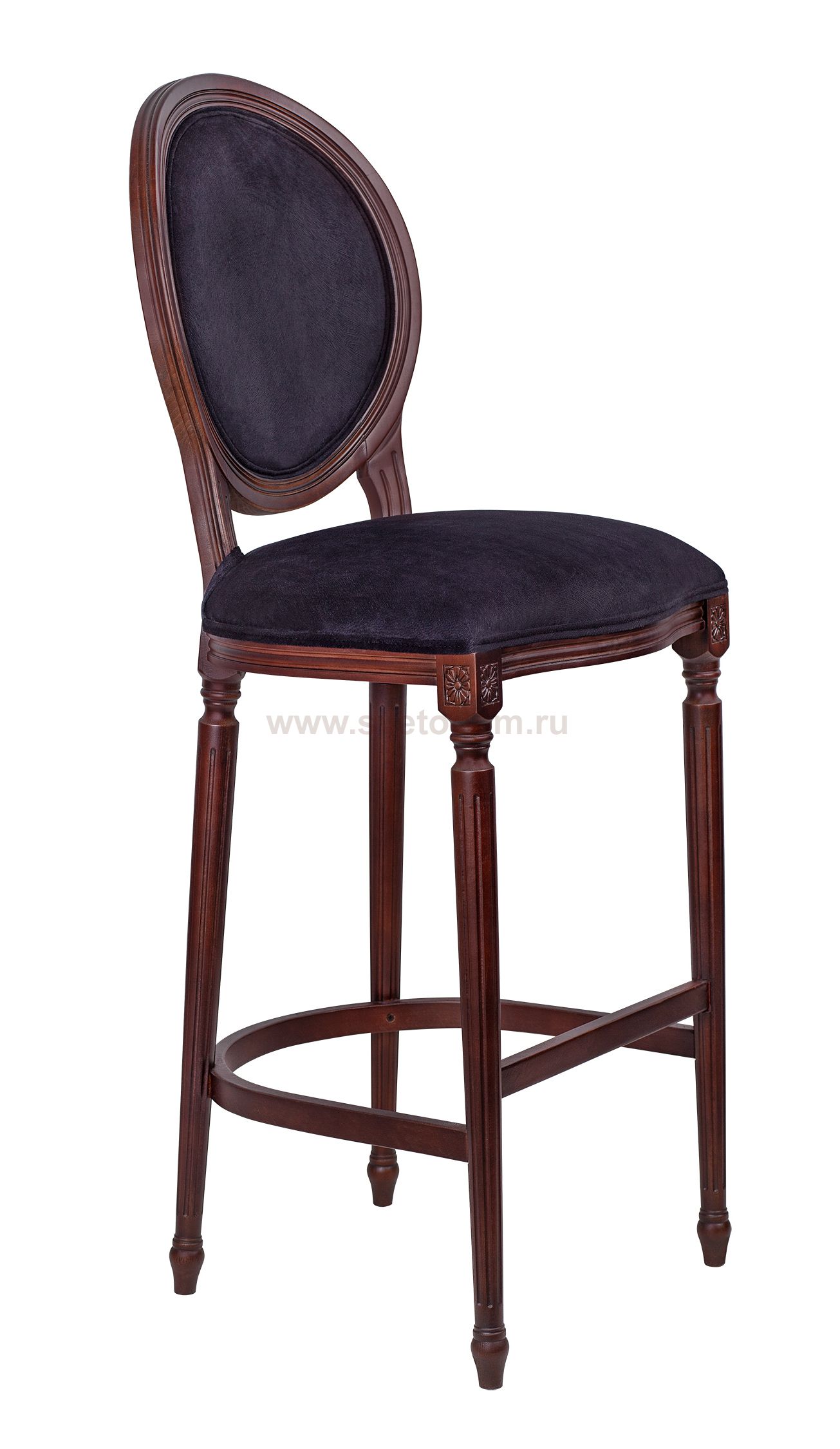 Стул барный Kosco Kora black на высоких ножках, декорированных резьбой и соединенных между собой попарно нижними планками. Каркас выполнен из натурального букового дерева. Обивка из велюра, мягкое сиденье и круглая спинка, напоминающая медальон в деревянном обрамлении.