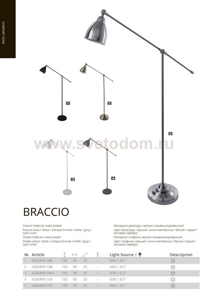 Светильник напольный Arte lamp A2054PN-1WH Braccio – это не просто функциональный предмет интерьера, позволяющий обеспечить дополнительное освещение, но и оригинальный декоративный элемент. Такой напольный светильник можно использовать для интерьера не только гостиной, но и спальни или кабинета. А в комплекте с люстрой, бра или настольной лампой из этой же коллекции сделает интерьер по-дизайнерски профессиональным и законченным.