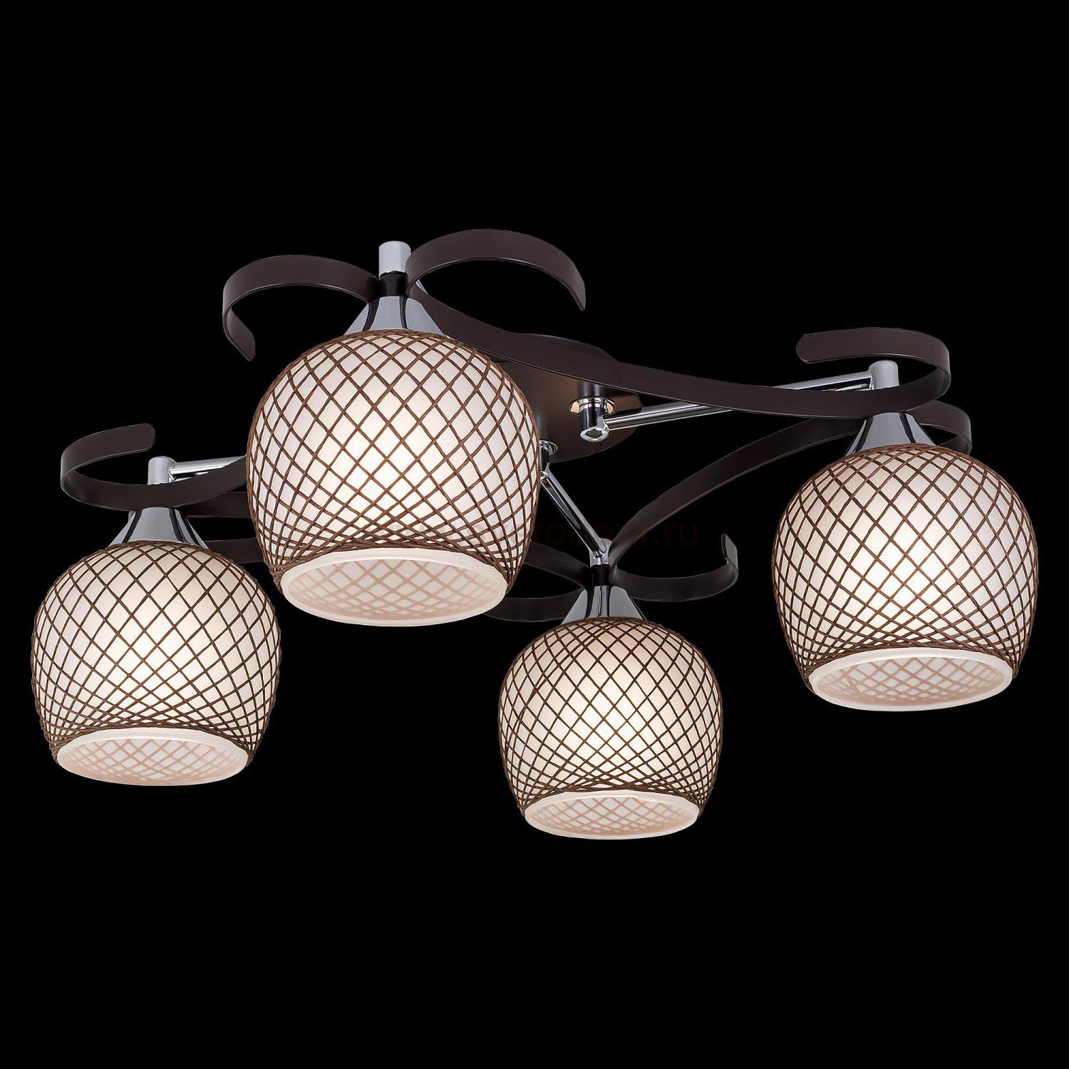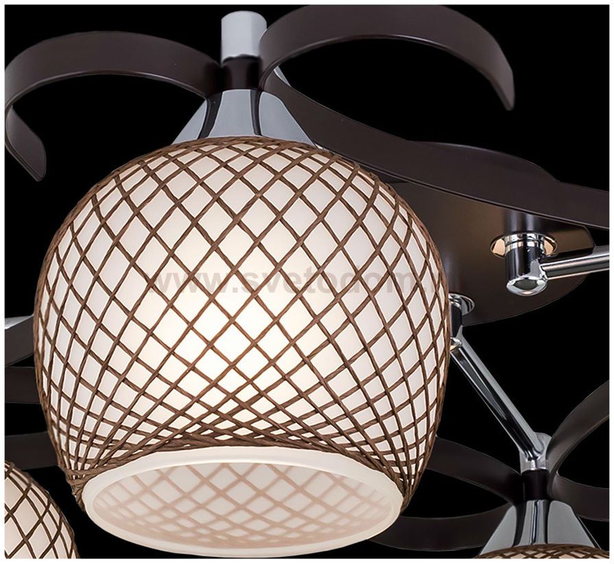 Потолочная люстра с 4-мя рожками из изящной коллекции «Сюзи». Металлическая конструкция люстры со стеклянными плафонами, ажурно оплетенными необычным тканевым узором, делающим светильник в буквальном смысле слова «вязаным» создаст атмосферу уюта и комфорт Штрих-код