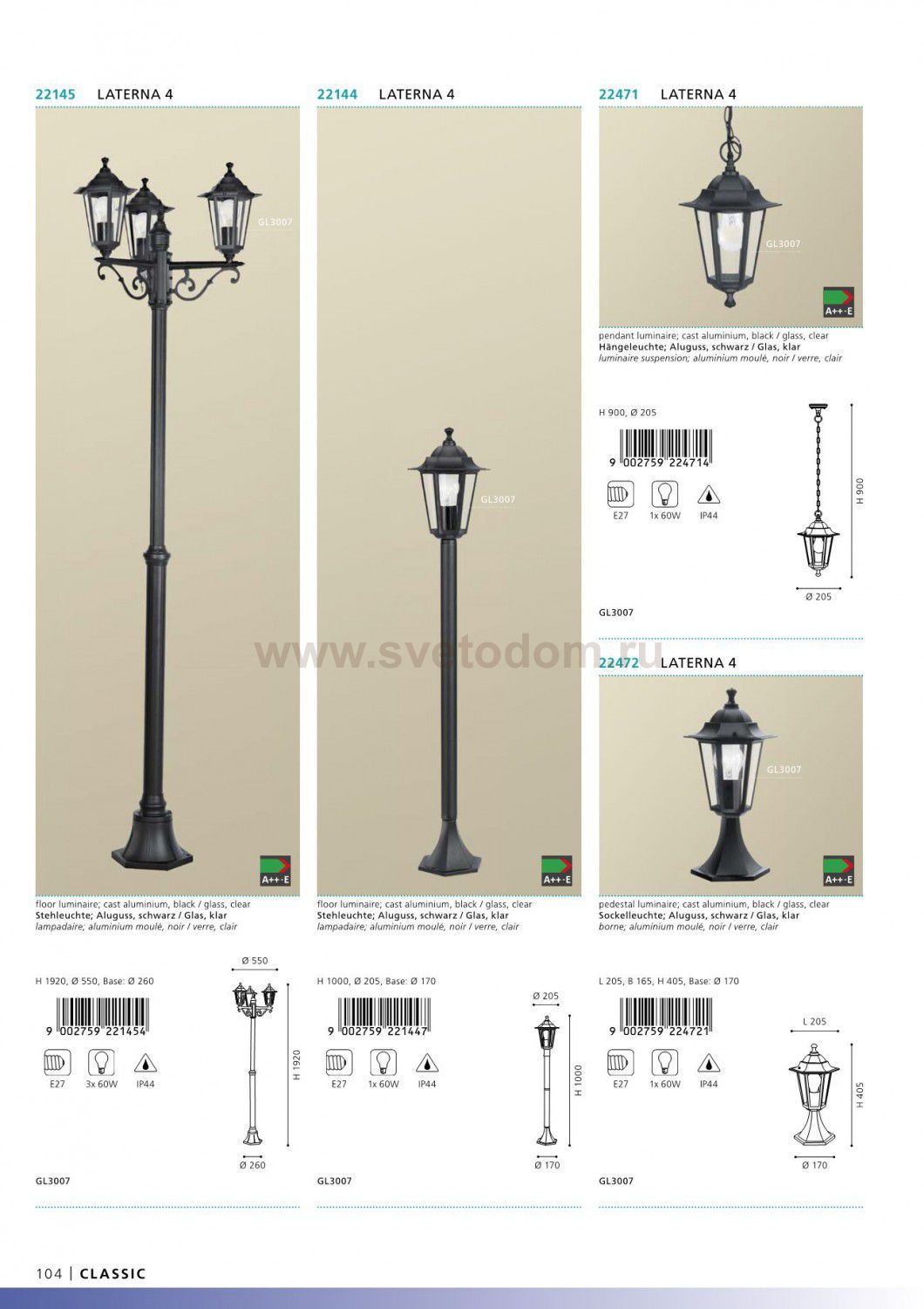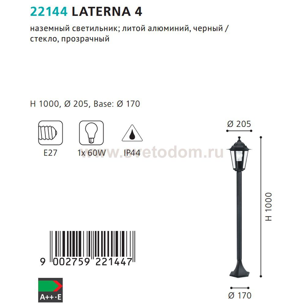Обеспечение качественного уличного освещения – важная задача для владельцев коттеджей. Компания «Светодом» предлагает современные светильники, которые порадуют Вас отличным исполнением. В нашем каталоге представлена продукция известных производителей, пользующихся популярностью благодаря высокому качеству выпускаемых товаров. Уличный светильник Eglo 22144 не просто обеспечит качественное освещение, но и станет украшением Вашего участка. Модель выполнена из современных материалов и имеет влагозащитный корпус, благодаря которому ей не страшны осадки. Купить уличный светильник Eglo 22144, представленный в нашем каталоге, можно с помощью онлайн-формы для заказа. Чтобы задать имеющиеся вопросы, звоните нам по указанным телефонам.