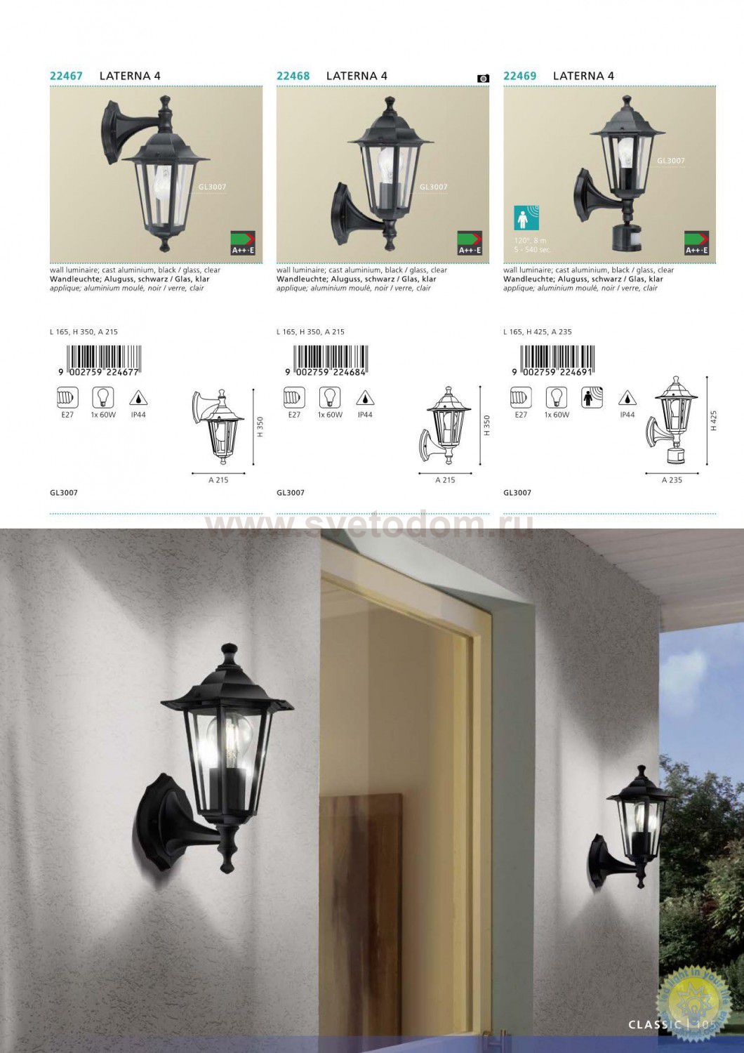 Есть Отзывы Светильник уличный Eglo 22467 LATERNA 4Пока нет отзывов об этом товаре, напишите и он обязательно появится после модерации! Оставить свой отзывПохожие товары Другие товары магазина Фото