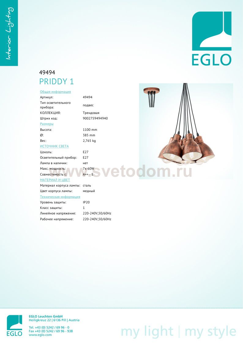Компания «Светодом» предлагает широкий ассортимент люстр от известных производителей. Представленные в нашем каталоге товары выполнены из современных материалов и обладают отличным качеством. Благодаря широкому ассортименту Вы сможете найти у нас люстру под любой интерьер. Мы предлагаем как классические варианты, так и современные модели, отличающиеся лаконичностью и простотой форм. Стильная люстра Eglo 49494 станет украшением любого дома. Эта модель от известного производителя не оставит равнодушным ценителей красивых и оригинальных предметов интерьера. Люстра Eglo 49494 обеспечит равномерное распределение света по всей комнате. При выборе обратите внимание на характеристики, позволяющие приобрести наиболее подходящую модель. Купить понравившуюся люстру по доступной цене Вы можете в интернет-магазине «Светодом».