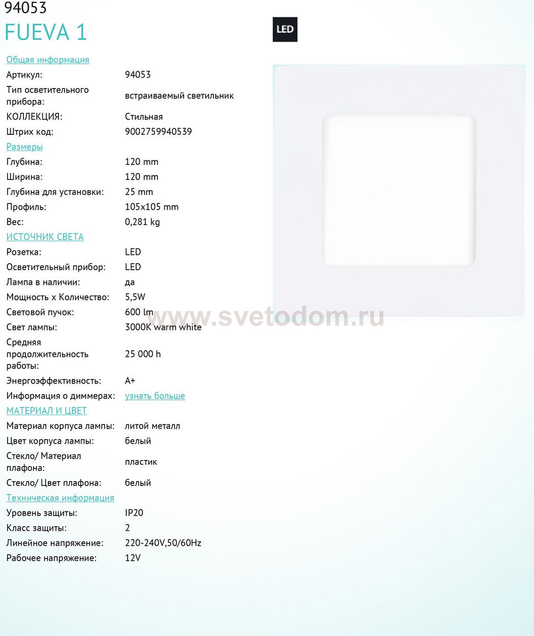 Встраиваемые светильники – популярное осветительное оборудование, которое можно использовать в качестве основного источника или в дополнение к люстре. Они позволяют создать нужную атмосферу атмосферу и привнести в интерьер уют и комфорт. Интернет-магазин «Светодом» предлагает стильный встраиваемый светильник Eglo 94053. Данная модель достаточно универсальна, поэтому подойдет практически под любой интерьер. Перед покупкой не забудьте ознакомиться с техническими параметрами, чтобы узнать тип цоколя, площадь освещения и другие важные характеристики. Приобрести встраиваемый светильник Eglo 94053 в нашем онлайн-магазине Вы можете либо с помощью «Корзины», либо по контактным номерам. Мы развозим заказы по Москве, Екатеринбургу и остальным российским городам.