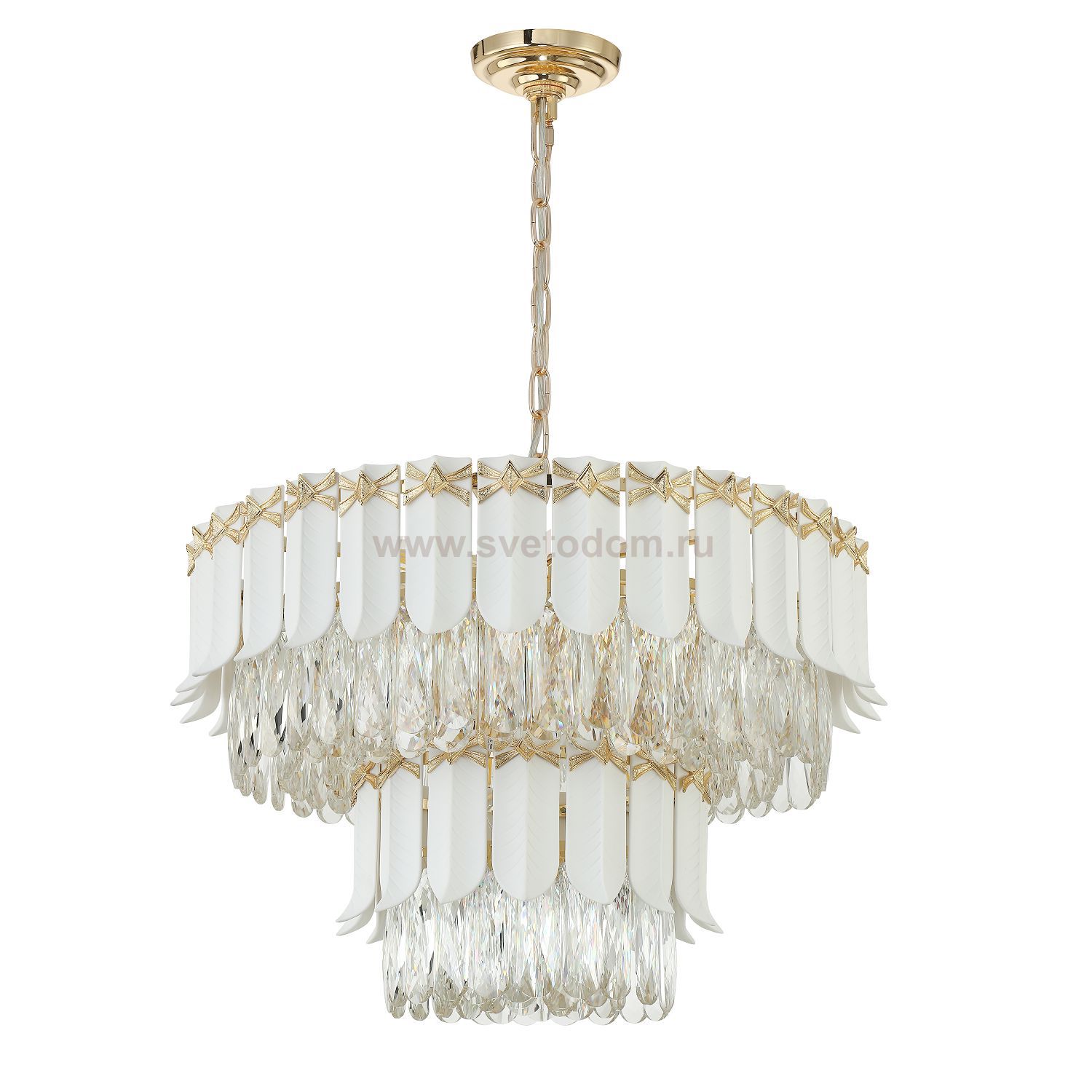 Каркас люстры цвета золото, верхний ряд выполнен из керамических лепестков, которые покрыты белой глазурью и украшены золотым декором. Нижние слои выполнены из высококачественного хрусталя удлиненной формы оригинальной огранки. При укорачивании цепи люстра модифицируется в потолочный светильник Штрих-код