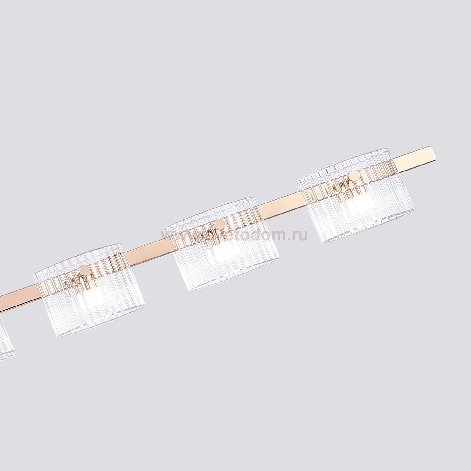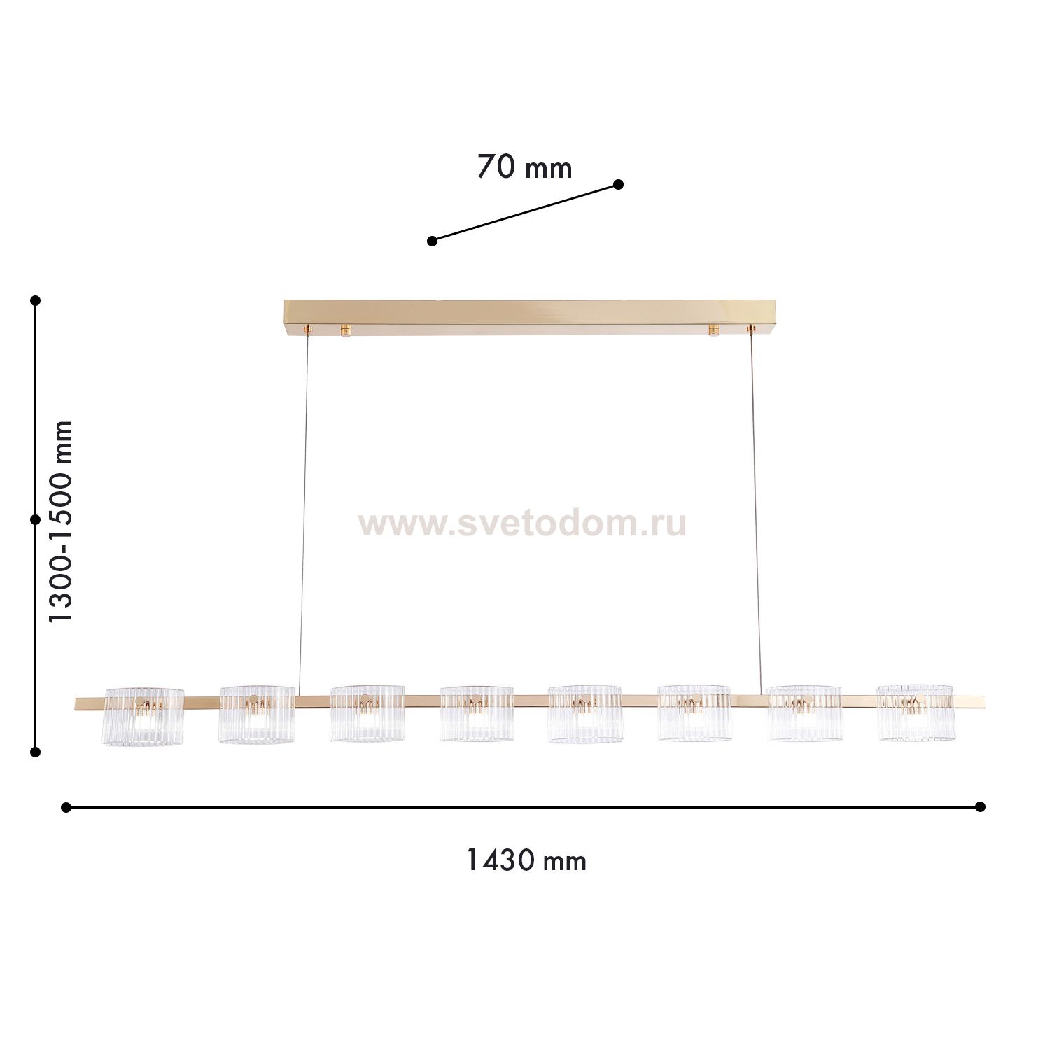 Подвесная люстра длиной 143 см с прозрачными рифлеными плафонами, каждый из которых состоит из двух слегка выгнутых стекол, закрепленных на заклепках Серия