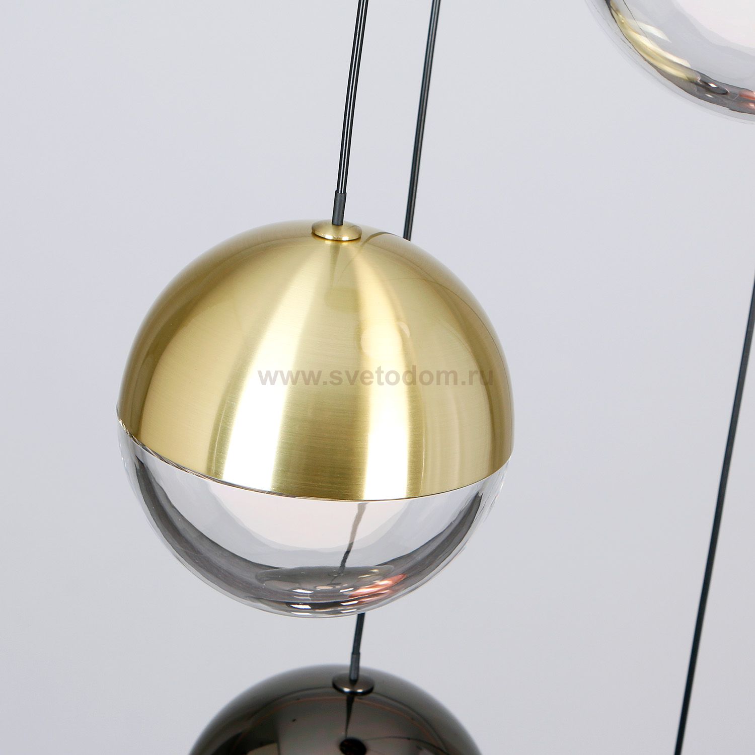 Потолочная каскадная люстра с черным каркасом, с шарообразными плафонами разных цветом, разделенными на две части — металлическую и акриловую, LED-мод Декор