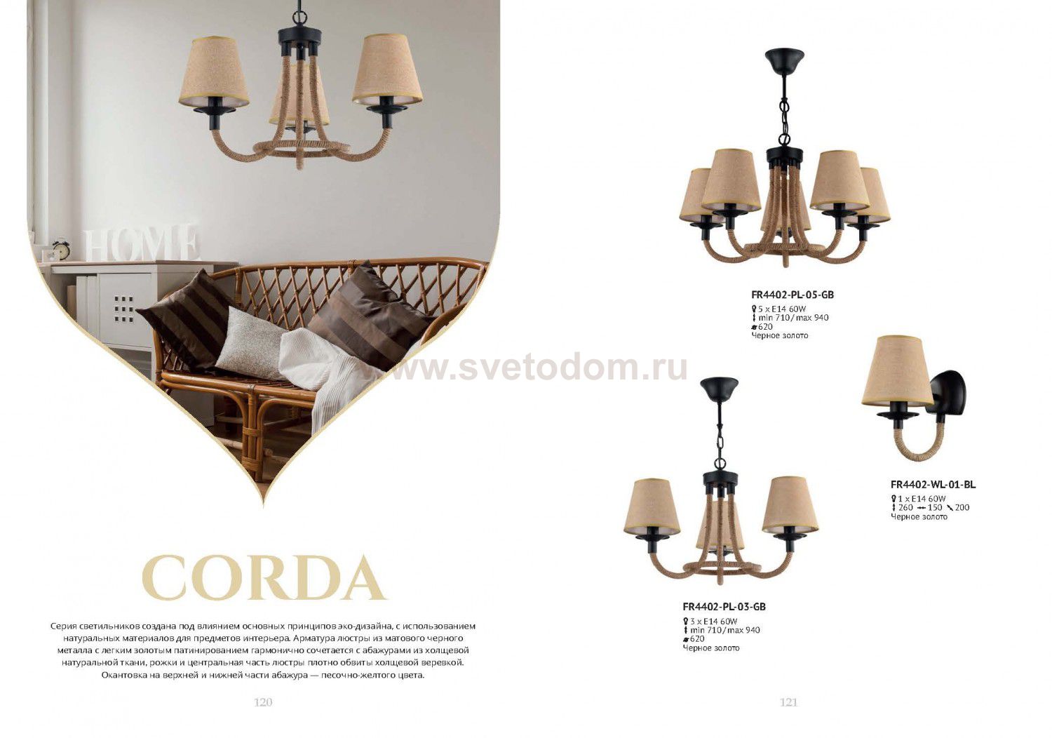 Серия светильников создана под влиянием основных принципов эко-дизайна, с использованием натуральных материалов для предметов интерьера. Арматура люстры из матового черного металла с легким золотым патинированием гармонично сочетается с абажурами из холщовой натуральной ткани. Рожки и центральная часть люстры плотно обвиты холщовой веревкой. Окантовка на верхней и нижней части абажура желто-песочного цвета.