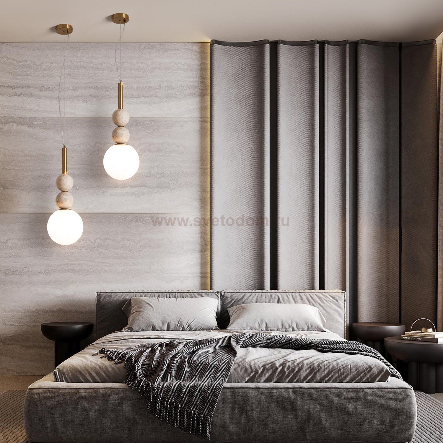Серия Sunspot использует камень травертин как основной декоративный элемент. Настенные бра в двух вариантах: с матовым белым стеклянным плафоном и со «скользящим» теплым светом. Отличительная черта бра: увеличенный размер плафона и сенсорное включение/выключение без диммирования. Подвесные светильники имеют прозрачные стеклянные плафоны с декоративными шариками из камня травертин. Sunspot включают три модели подвесов разных размеров и форм стеклянной окантовки на плафон. Арматура — металл латунного и черного цвета Источники света LED 3000K и цоколь G9. Настольная лампа с touch переключателем . Серия создает комплексное зональное и акцентное освещение, подходящее для создания уютной атмосферы.
