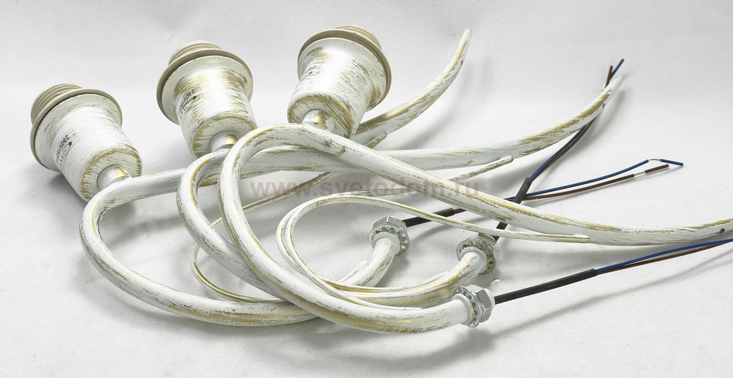 Сочетание оттенков белого цвета в осветительных приборах позволяет визуально облегчить изделие. Тонкая белая ткань на абажурах минимально задерживает свет от ламп и немного даже его рассеивает. В серии есть люстра на пять абажуров для помещений побольше и на три абажура для помещений поменьше.