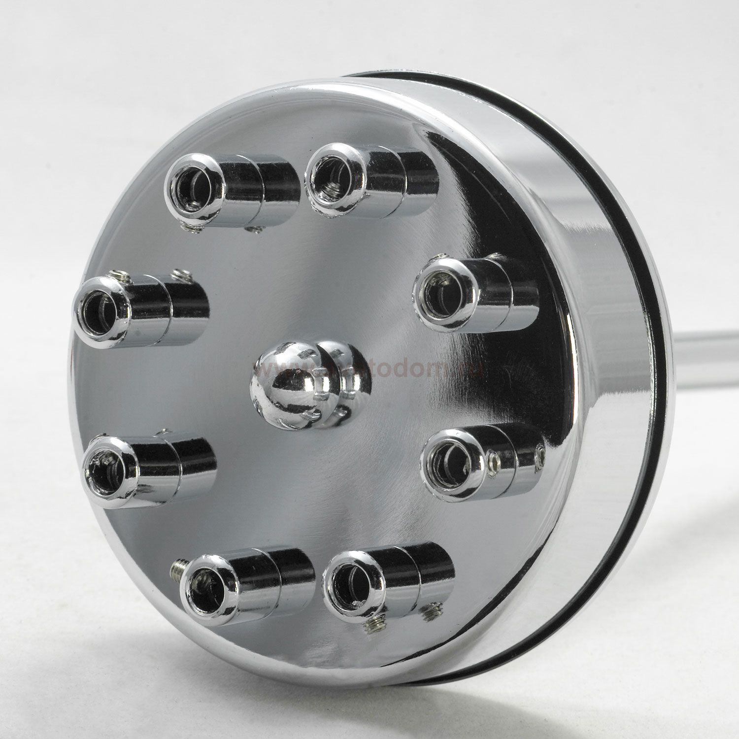 Классическая потолочная люстра в нетленном сочетании серого цвета абажуров и хромированной арматуры украсит интерьер как спальной комнаты так и гостиной. 8 ламп способны осветить помещение до 30 кв.м. Применение диммеров позволит дозировать свет для всех случаев.