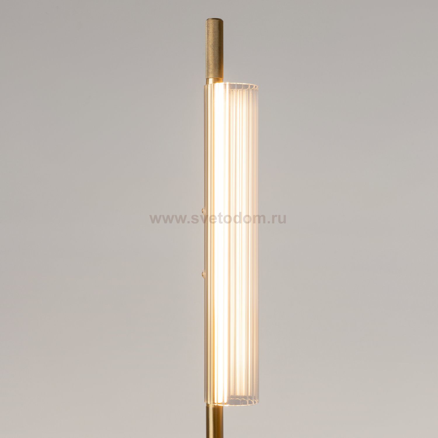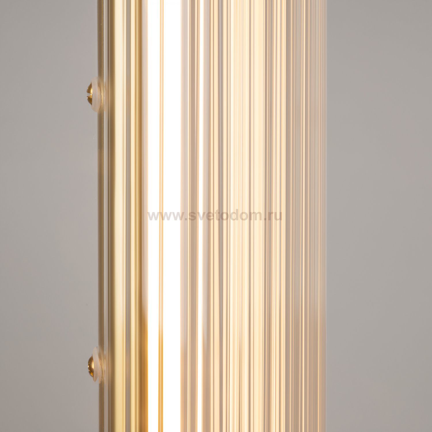 Арматура из металла, цвет - латунь с сатиновым финишем. Плафон из рифленого прозрачного стекла. LED-источник света. Теплая цветовая температура 3000К. Регулируемый по длине провод 3 метра у подвесного светильника. Подходит для помещений с высокими потолками. Торшер с push-кнопкой на проводе для удобного включения и выключения.