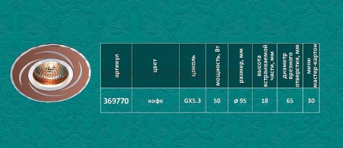 Встраиваемый светильник модели Novotech 369770 из серии VOODOO отличается следующим качеством: Светильник произведен из алюминия. Это лёгкий металл, основными достоинствами которого являются — устойчивость к практически всем видам негативного воздействия окружающей среды, коррозии, небольшой вес, по сравнению с другими видами металла и экологическая безопасность материала.