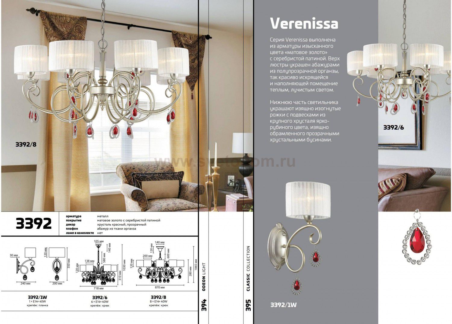 Удивительная модель 3392/1W от фабрики Odeon light (Италия) серии VERENISSA представляет собой светильник настенный бра выполненный по технически выверенным чертежам и эскизам итальянских дизайнеров. Подходит как для бытового, так и для общественного использования со стандартными и диодными лампами.