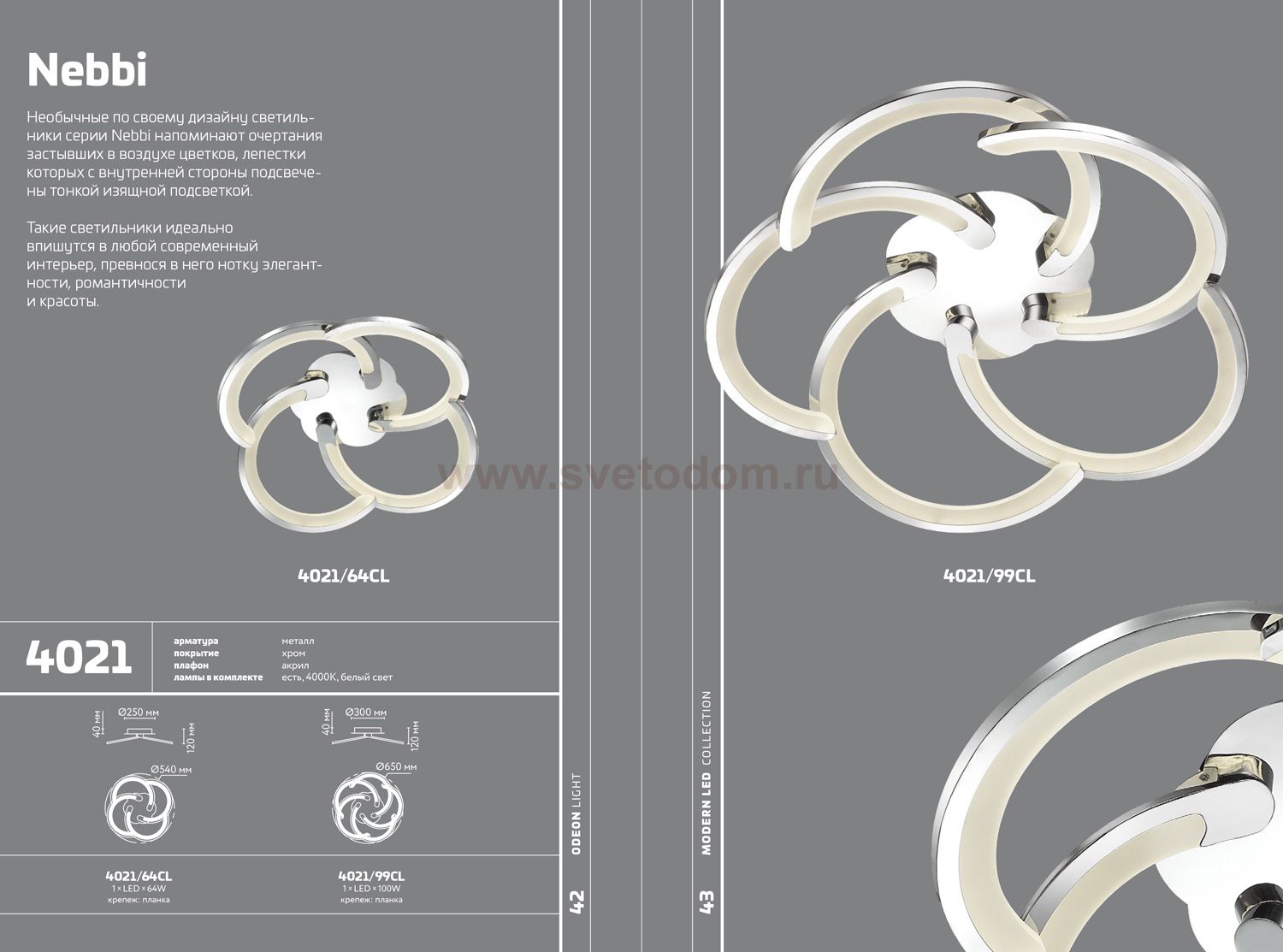Храктерная особенность артикула 4021/99CL: Необычная по своему дизайну люстра 4021/99CL серии Nebbi напоминает очертания застывшего в воздухе цветка, лепестки которого с внутренней стороны подсвечены тонкой изящной подсветкой. Такая люстра идеально впишется в любой современный интерьер, превнося в него нотку элегантности, романтичности и красоты. Цоколь LED. Мощность 100W.