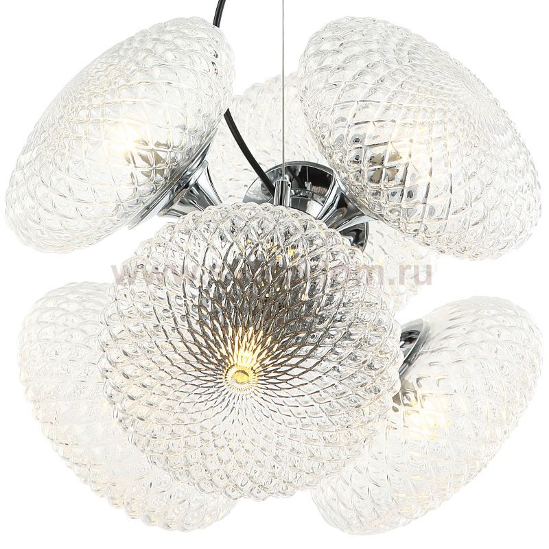 Люстра подвесная 2095/09/06P Stilfort серии Roxie выполнена в стиле модерн. Арматура изготовлена из окрашенного металла в цвете "хром". Плафоны люстры из текстурированного стекла, полностью прозрачные.