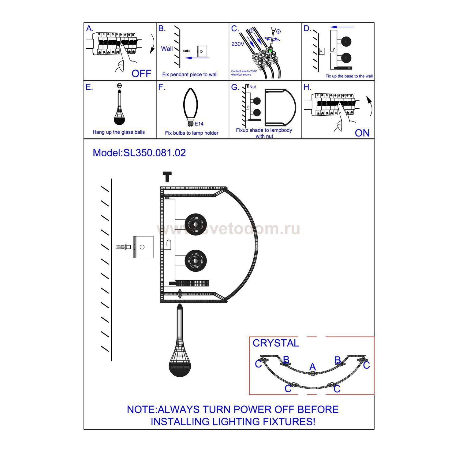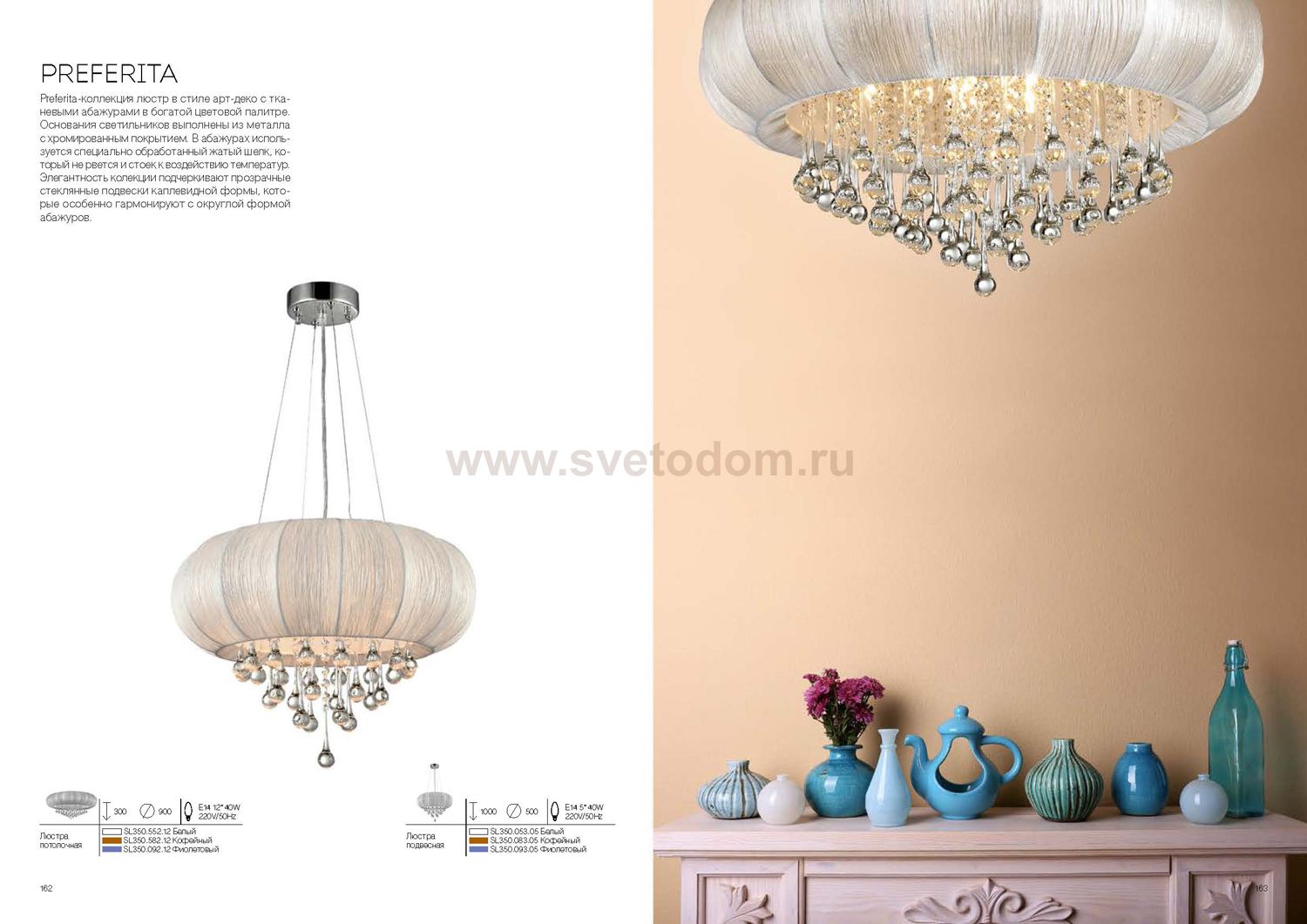 Касаемо коллекции модели St luce SL350.081.02 хотелось бы отметить основные моменты: Preferita-коллекция люстр в стиле арт-деко с тканевыми абажурами в богатой цветовой палитре. Основания светильников выполнены из металла с хромированным покрытием. В абажурах используется специально обработанный жатый шелк, который не рвется и стоек к воздействию температур. Элегантность колекции подчеркивают прозрачные стеклянные подвески каплевидной формы, которые особенно гармонируют с округлой формой абажуров.