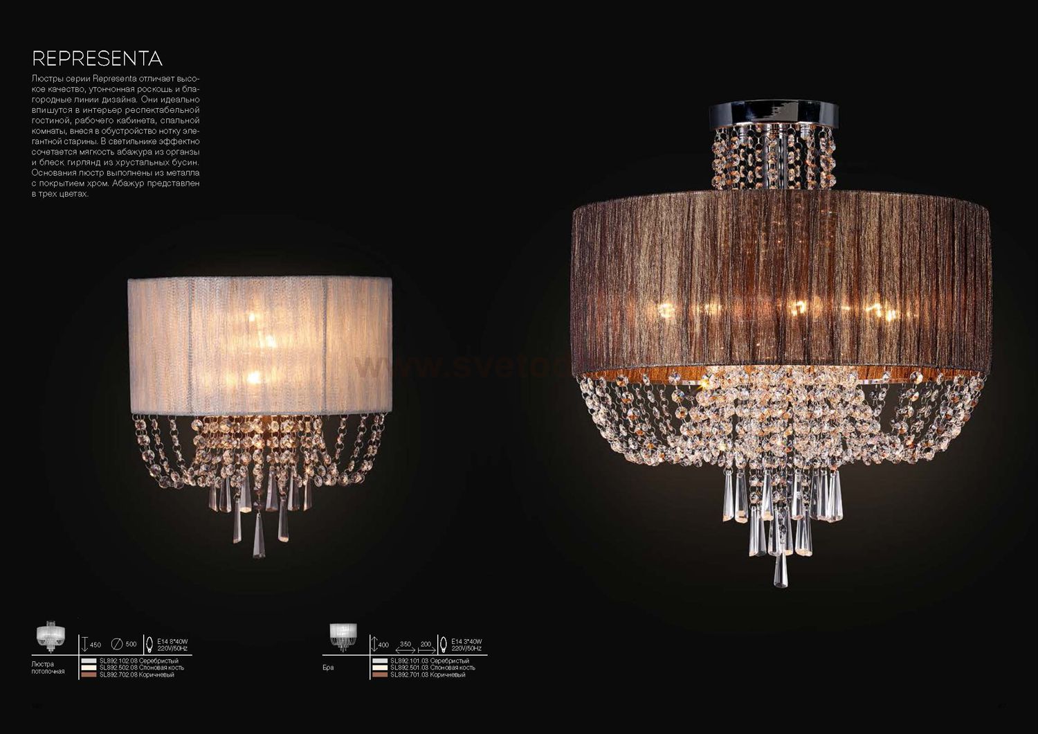 Касаемо коллекции модели St luce SL892.502.08 хотелось бы отметить основные моменты: Люстры серии Representa отличает высокое качество, утончонная роскошь и благородные линии дизайна. Они идеально впишутся в интерьер респектабельной гостиной, рабочего кабинета, спальной комнаты, внеся в обустройство нотку элегантной старины. В светильнике эффектно сочетается мягкость абажура из органзы и блеск гирлянд из хрустальных бусин. Основания люстр выполнены из металла с покрытием хром. Абажур представлен в трех цветах.