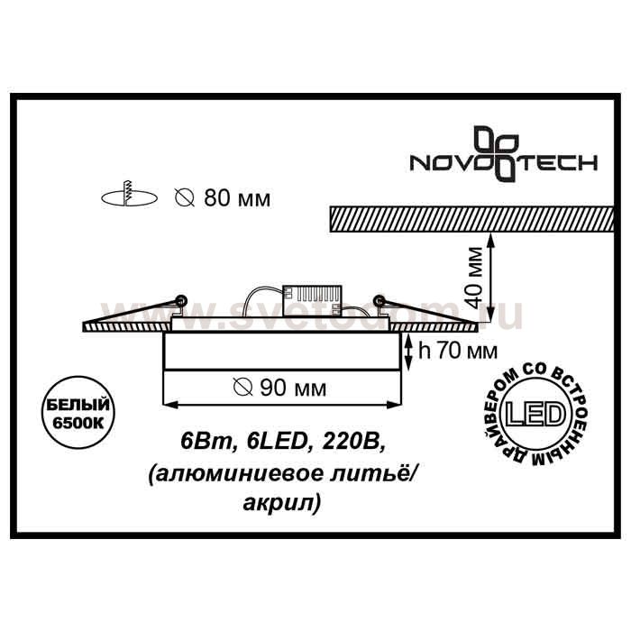 Встраиваемый неповоротный светодиодный светильник, укомплектован блоком питания модели Novotech 357052 из серии EASE отличается следующим качеством: Основание светильника – алюминиевое литьё. Это сплав, основными достоинствами которого являются — устойчивость к практически всем видам негативного воздействия окружающей среды, коррозии, небольшой вес, по сравнению с другими видами металла и экологическая безопасность материала. Рассеиватель произведён из акрила. Свойствами которого являются: высокая светопропускаемость — 92 %, которая не изменяется с течением времени, сохраняя свой оригинальный цвет, сопротивляемость удару в 5 раз больше, чем у стекла, устойчивость к воздействию влаги, бактерий и микроорганизмов, морозостойкость и экологичность.