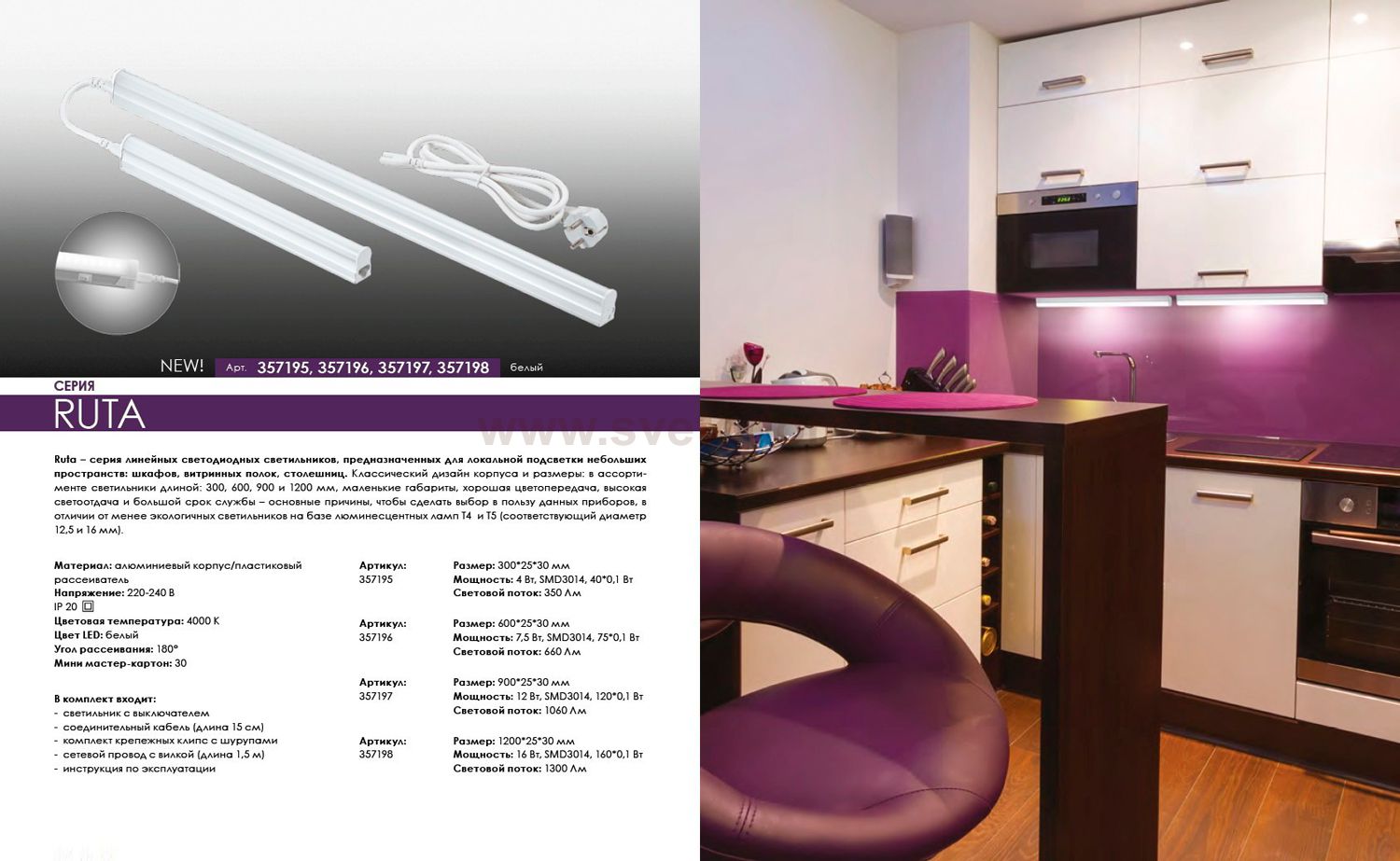 Линейный светодиодный светильник, предназначенный для локальной подсветки небольших пространств: шка модели Novotech 357195 из серии RUTA отличается следующим качеством: Корпус светильника произведен из алюминия. Это металл, основными достоинствами которого являются — устойчивость к практически всем видам негативного воздействия окружающей среды, коррозии, небольшой вес, по сравнению с другими видами металла и экологическая безопасность материала. Рассеиватель сделан из пластика. Он отличается повышенной стойкостью к механическим повреждениям и защищенностью от факторов внешней среды.