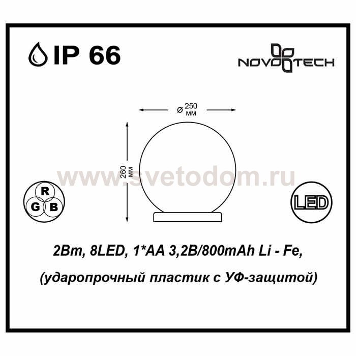 Садовый светодиодный светильник с выключателем модели Novotech 357200 из серии ALICE отличается следующим качеством: Шар - светильник, сделанный из ударопрочного пластика, имеет высокие эксплуатационные показатели, что объясняется его повышенной стойкостью к механическим повреждениям и защищенностью от факторов внешней среды. Уф – защита обеспечивает более долговечный срок службы и гарантия от выцветания. Безопасность (отсутстствие внешних проводов), простота в установке и многократное перемещение (по необходимости), экологичность, долговечность, прочность, экономичность, эффектность (отличное дополнение любого дома или участка.) Срок службы светодиодов - 30000 часов. Время перезаряда - 2 часа. Время автономной работы - 2 часа. Диапазон рабочих температур от -10 до +50 градусов Цельсия.