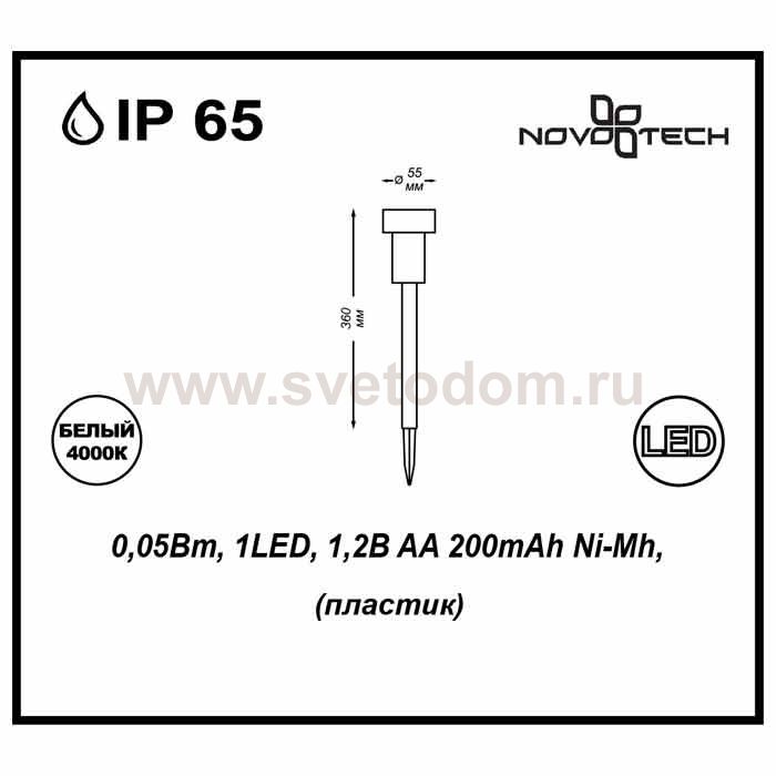 Светильник садовый на солнечных батареях с выключателем модели Novotech 357206 из серии SOLAR отличается следующим качеством: Светильник, сделанный из пластика, имеет высокие эксплуатационные показатели, что объясняется его повышенной стойкостью к механическим повреждениям и защищенностью от факторов внешней среды. Безопасность (отсутстствие внешних проводов), простота в установке и многократное перемещение (по необходимости), экологичность, долговечность, прочность, экономичность, эффектность (отличное дополнение любого дома или участка.) Срок службы светодиодов - 30000 часов. Время заряда 8 - 10 часов. Время автономной работы - 6 часов. Диапазон рабочих температур от -10 до +50 градусов Цельсия.