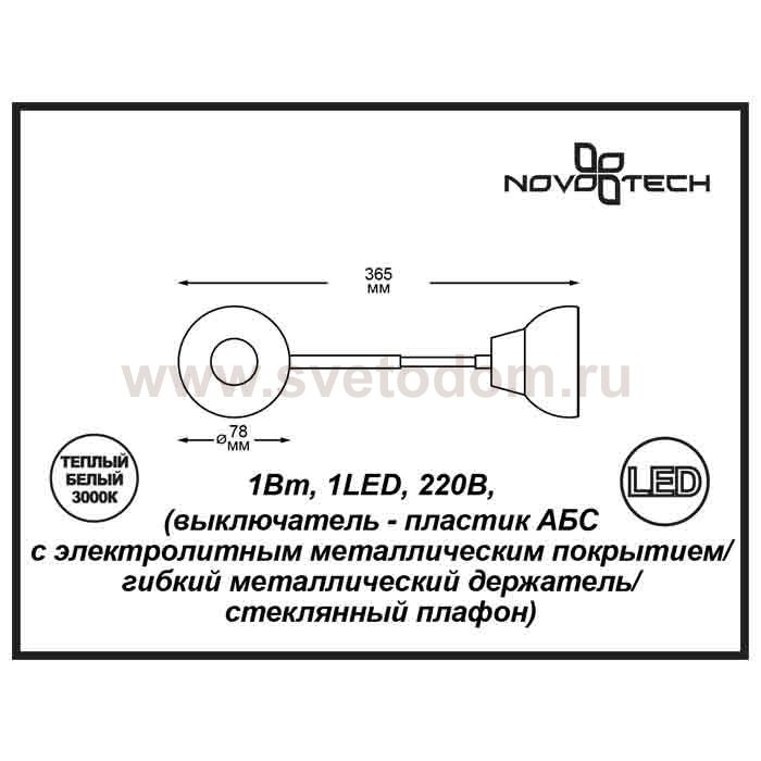 Светильник-ночник (в розетку) светодиодный с выключателем - диммером модели Novotech 357323 из серии NIGHT LIGHT отличается следующим качеством: Выключатель светильника сделан из пластика АБС. Преимуществами данного материала являются: 1. Химическая инертность – материал устойчив к воздействию кислот и щелочей, продуктов нефтепереработки; 2. Устойчивость к воздействию влаги; 3. Ударопрочность; 4. Долговечность; 5. Ровная поверхность Гибким металлическим держателем позволяет изменять направление и угол освещения. Наличие светорегулятора (диммера) позволяет плавно управлять процессом освещения.