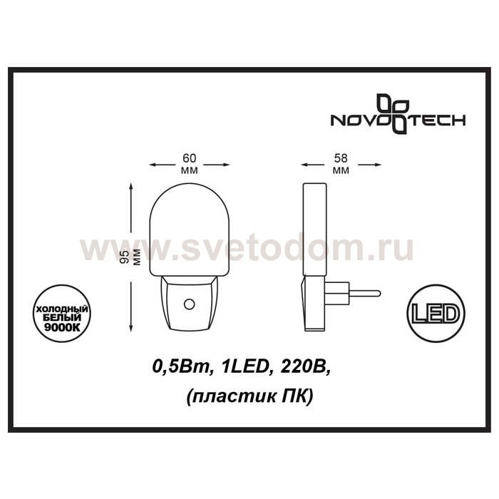 Светильник-ночник (в розетку) светодиодный с датчиком света модели Novotech 357326 из серии NIGHT LIGHT отличается следующим качеством: Корпус светильника сделан из пластика ПК. Преимуществами данного материала являются: 1. Химическая инертность – материал устойчив к воздействию кислот и щелочей, продуктов нефтепереработки; 2. Устойчивость к воздействию влаги; 3. Ударопрочность; 4. Долговечность; 5. Ровная поверхность Датчик света (датчик освещённости) – свет включается при наступлении темноты и недостаточном освещении.