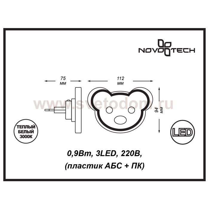 Светильник-ночник (в розетку) светодиодный с выключателем модели Novotech 357332 из серии NIGHT LIGHT отличается следующим качеством: Корпус светильника сделан из пластика АБС + ПК. Преимуществами данного материала являются: 1. Химическая инертность – материал устойчив к воздействию кислот и щелочей, продуктов нефтепереработки; 2. Устойчивость к воздействию влаги; 3. Ударопрочность; 4. Долговечность; 5. Ровная поверхность.