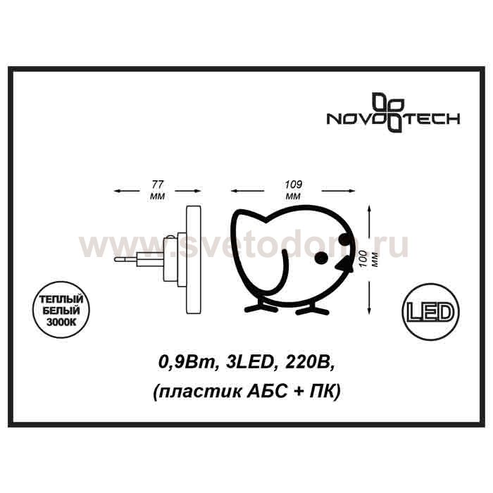 Светильник-ночник (в розетку) светодиодный с выключателем модели Novotech 357336 из серии NIGHT LIGHT отличается следующим качеством: Корпус светильника сделан из пластика АБС + ПК. Преимуществами данного материала являются: 1. Химическая инертность – материал устойчив к воздействию кислот и щелочей, продуктов нефтепереработки; 2. Устойчивость к воздействию влаги; 3. Ударопрочность; 4. Долговечность; 5. Ровная поверхность.