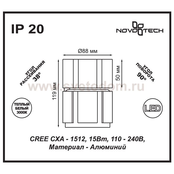 Строгие геометрические формы светильника позволяют использовать его как в классических, так и в современных дизайнерских интерьерах. Корпус светильника изготовлен из алюминия высочайшего качества. Для покрытия использовалась порошковая краска и специальный лак, что делает светильник устойчивым к механическим повреждениям и гарантирует долговечность эксплуатации. В качестве источника света в светильнике использован CREE CXA-1512 светодиод. Светильник имеет степень влагозащищенности (IP20), поэтому подходит для установки только в квартире или другом сухом помещении, где он не будет находиться под воздействием влаги. Этот светильник предназначен для накладного монтажа, что позволяет устанавливать его уже после того, как смонтирован потолок. Безопасность