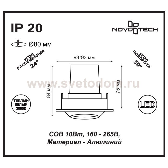 Поворотный даунлайт. Данный светильник позволит осветить как домашний интерьер в стиле Hi-Tec, так и любое торговое помещение, где необходима светодиодная подсветка товаров. Особенность модели заключается в прекрасном дизайнерском и технически функциональном использовании. Вы можете сами изменять направление свечения, так как светильник поворотный. Легкий корпус светодиодного светильника позволяет осуществлять монтаж в потолки любого типа: гипсокартон, реечный потолок, армстронг, натяжной потолок. Корпус светильника — литой алюминий. Также из алюминия выполнен радиатор, обеспечивающий идеальный отвод тепла от диода. Безопасность