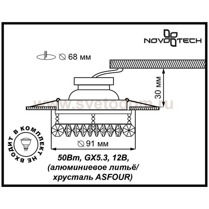 Декоративный встраиваемый светильник модели Novotech 369334 из серии FLAME1 отличается следующим качеством: Основание светильника – алюминиевое литьё. Это сплав, основными достоинствами которого являются — устойчивость к практически всем видам негативного воздействия окружающей среды, коррозии, небольшой вес, по сравнению с другими видами металла и экологическая безопасность материала. Декоративные подвески изготовлены из хрусталя ASFOUR , содержащего не менее 35 % окиси свинца. За исключением алмазов и других драгоценных камней, ни один материал не способен столь эффективно разложить луч света на цвета спектра, как хрусталь ASFOUR. В хрустале ASFOUR отсутствуют дефекты типа прожилок или пузырьков, поэтому он прозрачнее воздуха и воды. Столь высокое качество достигается благодаря использованию тщательно отобранного сырья и оригинальных производственных методик. Блеск хрусталя ASFOUR не потускнеет с течением времени. Каждая грань навсегда останется столь же точной; сам материал никогда не утратит своей чистоты и прозрачности. Благодаря фирменной технологии отделки, применяемой при изготовлении хрусталя ASFOUR,