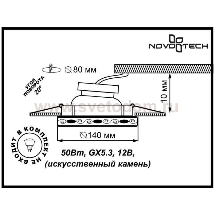 Декоративный встраиваемый поворотный светильник модели Novotech 369729 из серии CERAMIC отличается следующим качеством: Светильник сделан из искусственного камня. Этот материал отличается, без преувеличения, уникальными эксплуатационными качествами. Он прочный и долговечный, влагоустойчивый, гигиеничный (на гладкой поверхности бактерии не приживаются), термостойкий, экологичный и лёгкий. А так же тёплый на ощупь.