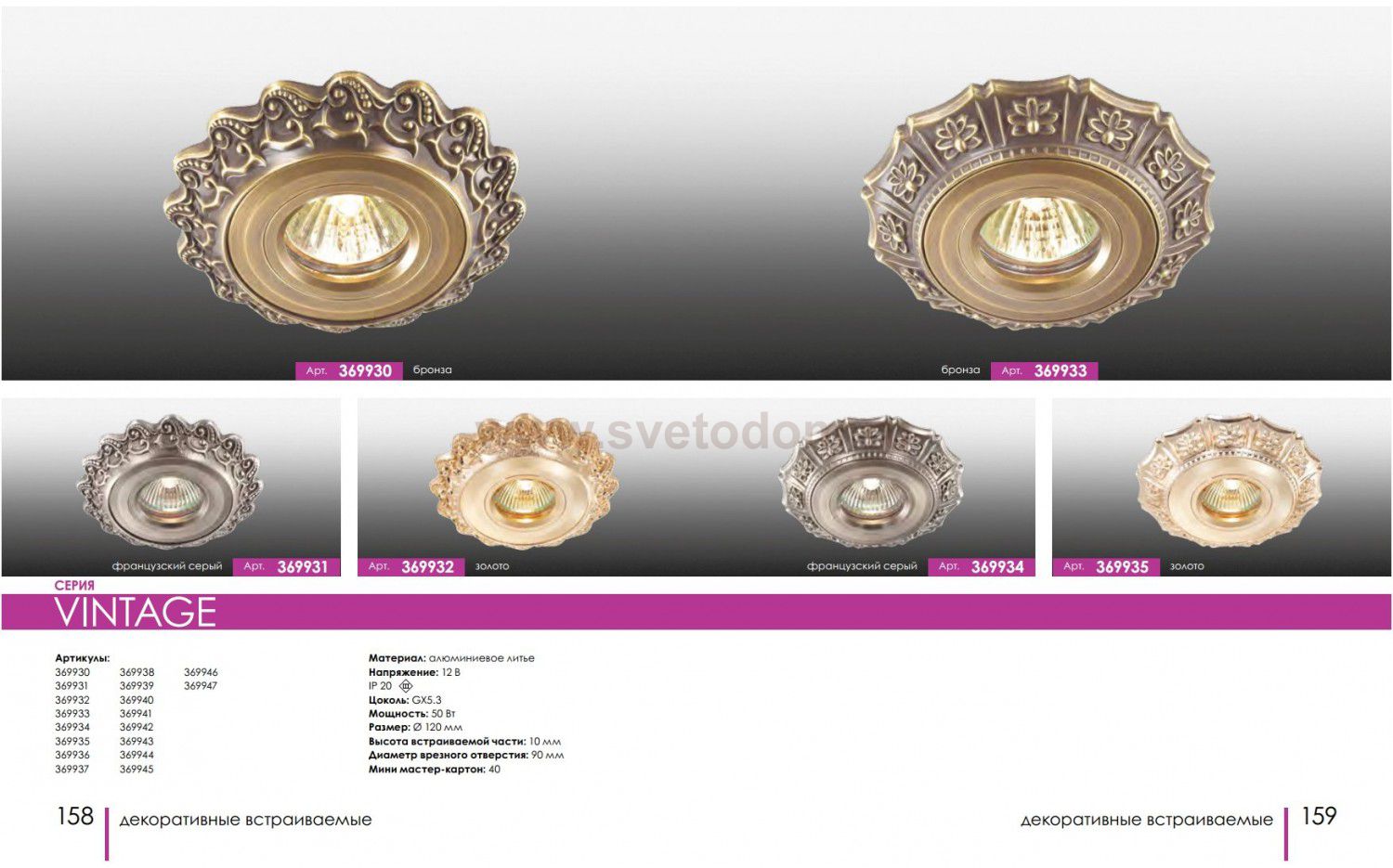 Декоративный встраиваемый светильник модели Novotech 369930 из серии VINTAGE отличается следующим качеством: Светильник сделан из алюминиевого литья. Это сплав, основными достоинствами которого являются — устойчивость к практически всем видам негативного воздействия окружающей среды, коррозии, небольшой вес, по сравнению с другими видами металла и экологическая безопасность материала.