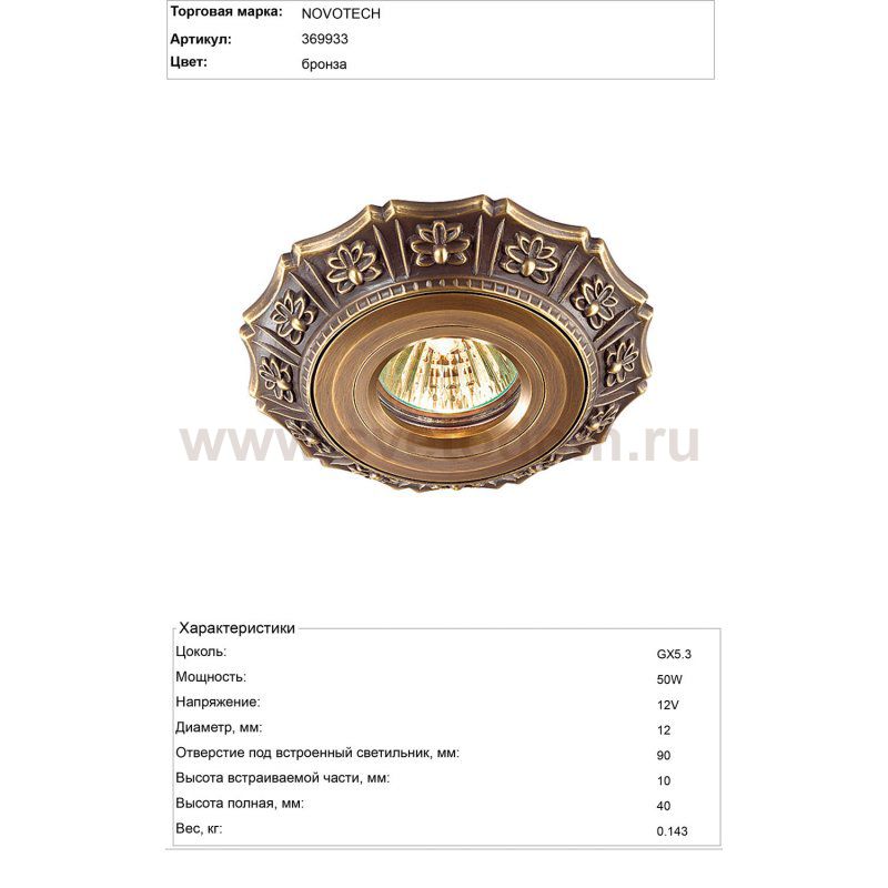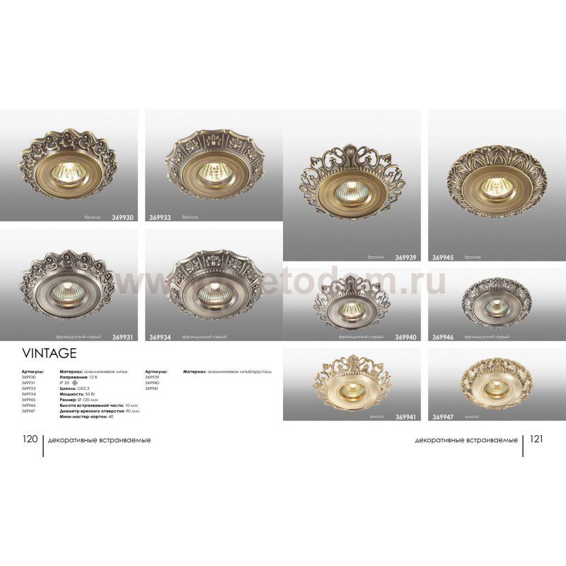 Декоративный встраиваемый светильник модели Novotech 369933 из серии VINTAGE отличается следующим качеством: Светильник сделан из алюминиевого литья. Это сплав, основными достоинствами которого являются — устойчивость к практически всем видам негативного воздействия окружающей среды, коррозии, небольшой вес, по сравнению с другими видами металла и экологическая безопасность материала.