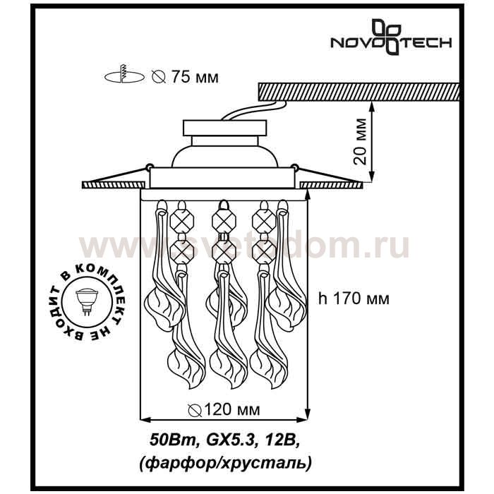 Декоративный встраиваемый светильник модели Novotech 369962 из серии PENDANT отличается следующим качеством: Светильник сделан из фарфора. Основным его преимуществом является то, что современем он нетеряет таких своих качеств, как крепость, плотность, прочность, блеск иполупрозрачность. Неподвластен фарфор икоррозии. Декоративные подвески сделаны из хрусталя. Он обладает высоким показателем плотности, прозрачности и блеска. Благодаря содержанию свинца (не менее 30%) и определённому подбору углов, образуемых гранями, изделия из хрусталя отличаются необыкновенно яркой, многоцветной игрой света, чарующей магией красоты, совершенства и роскоши.