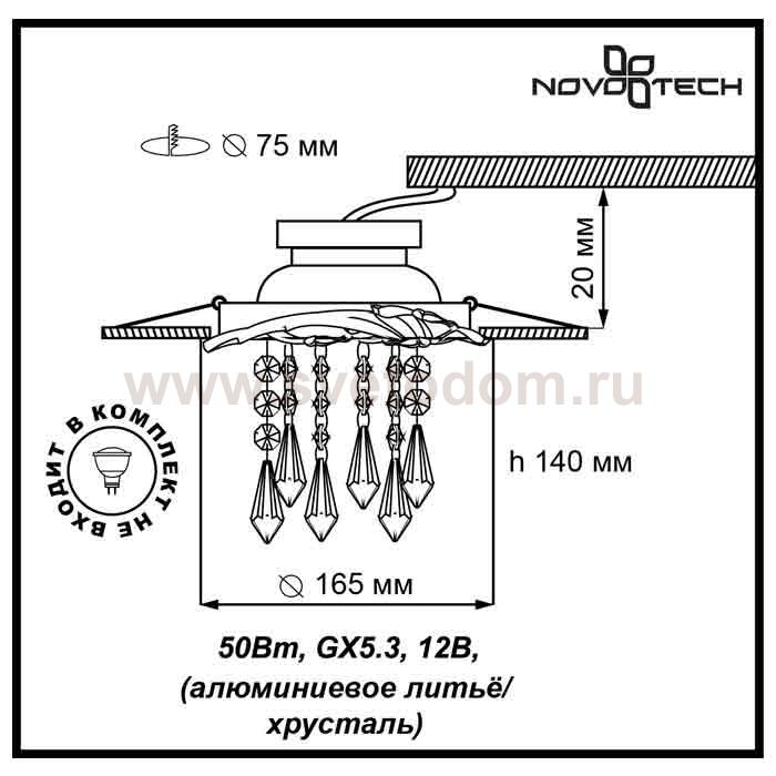 Декоративный встраиваемый светильник модели Novotech 369970 из серии GRAPE отличается следующим качеством: Корпус светильника – алюминиевое литьё. Это сплав, основными достоинствами которого являются — устойчивость к практически всем видам негативного воздействия окружающей среды, коррозии, небольшой вес, по сравнению с другими видами металла и экологическая безопасность материала. Декоративные плафон произведен из хрусталя. Он обладает высоким показателем плотности, прозрачности и блеска. Благодаря содержанию свинца (не менее 30%) и определённому подбору углов, образуемых гранями, изделия из хрусталя отличаются необыкновенно яркой, многоцветной игрой света, чарующей магией красоты, совершенства и роскоши.