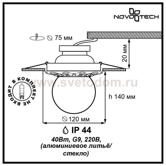 Встраиваемый светильник модели Novotech 369975 из серии SPHERE отличается следующим качеством: Корпус светильника – алюминиевое литьё. Это сплав, основными достоинствами которого являются — устойчивость к практически всем видам негативного воздействия окружающей среды, коррозии, небольшой вес, по сравнению с другими видами металла и экологическая безопасность материала. Декоративный плафон произведен из стекла. Стекло экологично, не тускнеет и не меняет своего оттенка со временем, не покрывается некрасивым налетом и легко выдерживает перепады температур.