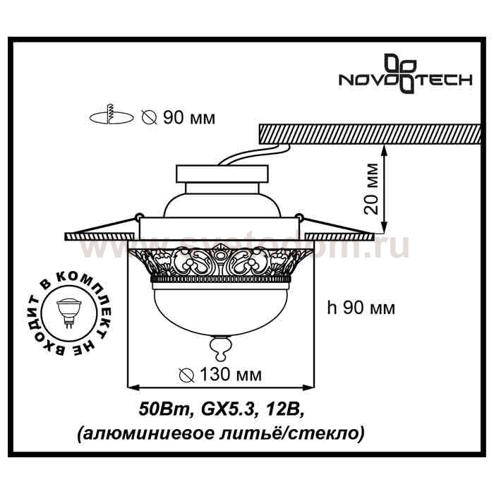 Декоративный встраиваемый светильник модели Novotech 369981 из серии BAROQUE отличается следующим качеством: Основание светильника – алюминиевое литьё. Это сплав, основными достоинствами которого являются — устойчивость к практически всем видам негативного воздействия окружающей среды, коррозии, небольшой вес, по сравнению с другими видами металла и экологическая безопасность материала. Декоративный плафон сделан из хрусталя. Он обладает высоким показателем плотности, прозрачности и блеска. Благодаря содержанию свинца (не менее 30%).