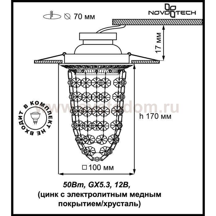 Декоративный встраиваемый светильник модели Novotech 369995 из серии GRAPE отличается следующим качеством: Корпус светильника произведено из сплава цинка. Благодаря сравнительно высоким механическим и литейным качествам, изделия, выполненные из сплава цинка, отличаются высокой точностью деталей декора со сложной конфигурацией. Так же он обладает антикоррозийными свойствами. Декоративные подвески сделаны из хрусталя. Он обладает высоким показателем плотности, прозрачности и блеска. Благодаря содержанию свинца (не менее 30%) и определённому подбору углов, образуемых гранями, изделия из хрусталя отличаются необыкновенно яркой, многоцветной игрой света, чарующей магией красоты, совершенства и роскоши.