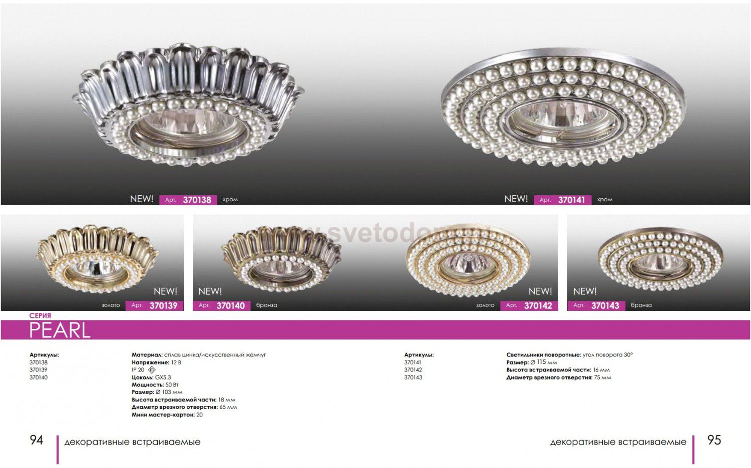 Декоративный встраиваемый светильник модели Novotech 370140 из серии PEARL отличается следующим качеством: Корпус светильника состоит из сплава цинка. Благодаря сравнительно высоким механическим и литейным качествам, изделия, выполненные из сплава цинка, отличаются высокой точностью деталей декора со сложной конфигурацией. Так же он обладает антикоррозийными свойствами. Отделка - искусственный жемчуг. Он отличается ярким блеском и идеальной формой бусин, по своей красоте не уступая настоящему и при электрическом освещении дает красивый эффект преломления света.
