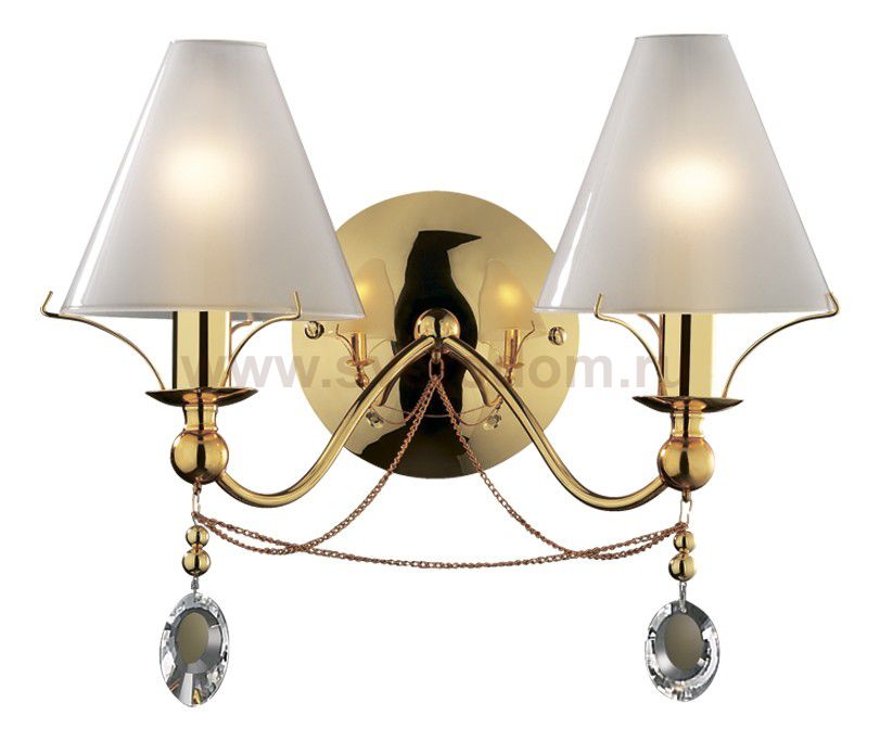 Этот светильник с двумя плафонами, направленными в разные стороны, идеально подойдет к интерьеру, если вы планируете осветить две соседние зоны, но не хотите загромождать пространство несколькими осветительными приборами. Каждый его элемент настолько совершенен и красив, что хочется смотреть на него снова и снова. Гармонично сочетаются круглые детали – крепление, части арматуры, и овальные подвески из крупного хрусталя. Цепочка, соединяющая светильники, образует треугольную форму, как и часть арматуры. Завершается эта конструкция белыми плафонами, которые создают мягкое освещение.