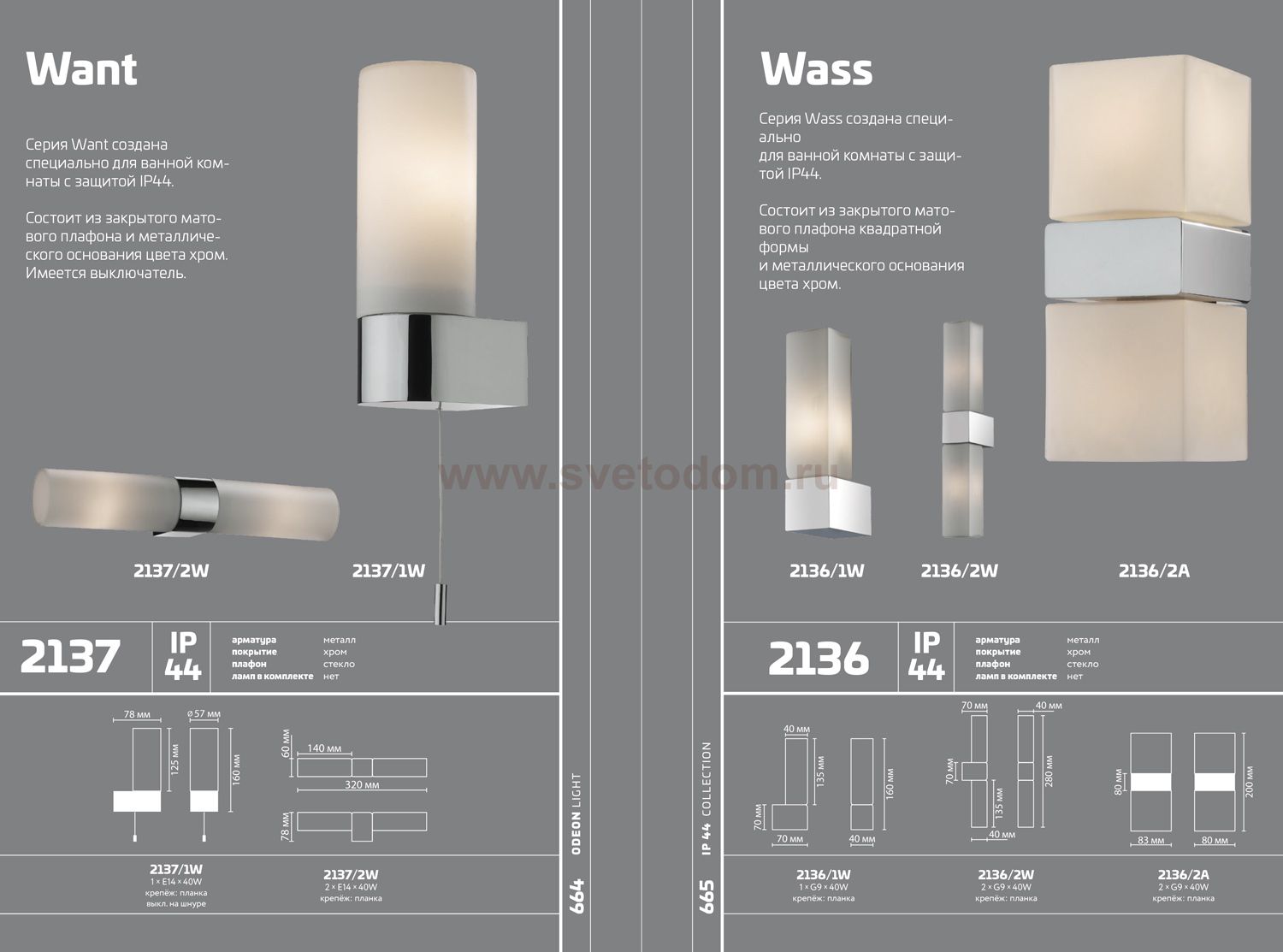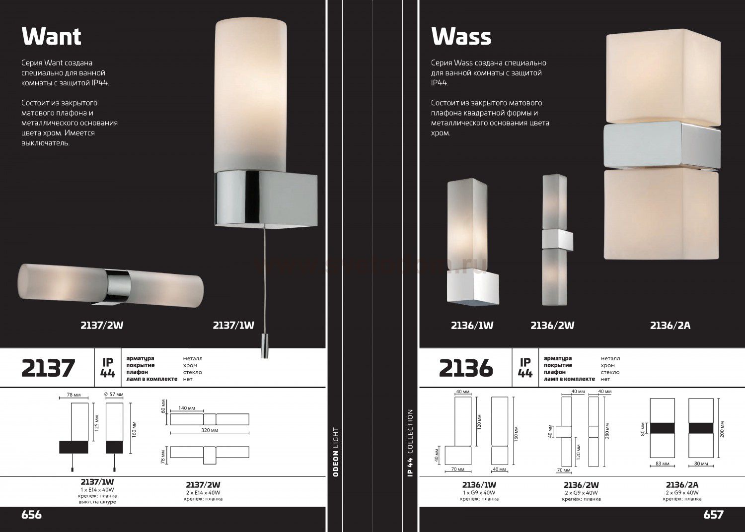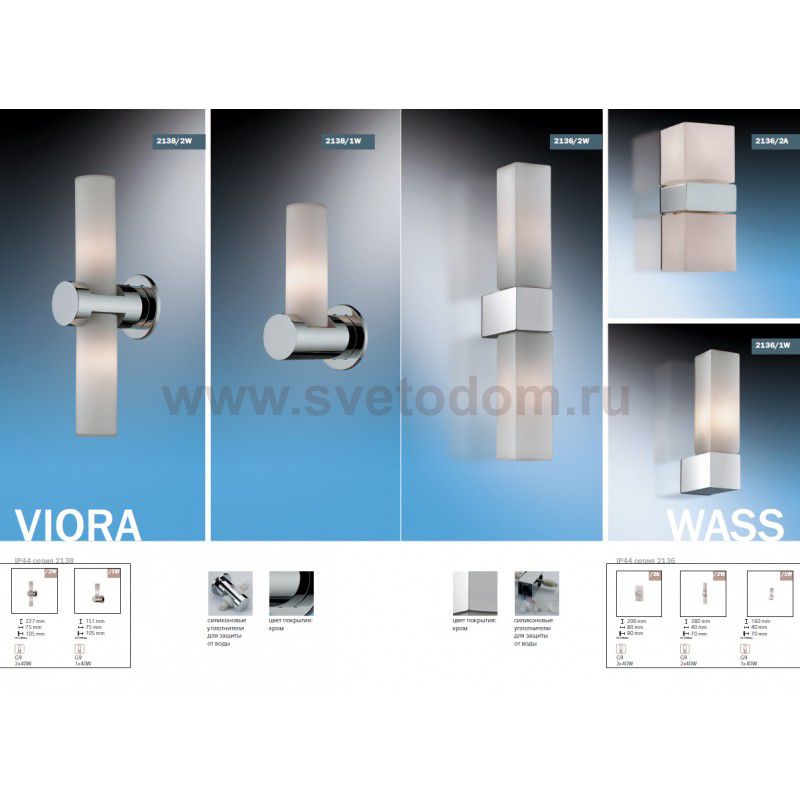 Настенный светильник 2136/1W линии Wass создан специально для ванной комнаты с защитой IP44. Состоит из закрытого матового плафона квадратной формы и металлического основания цвета хром. Цоколь G9. Мощность 1*40W. Нет ламп в комплекте.
