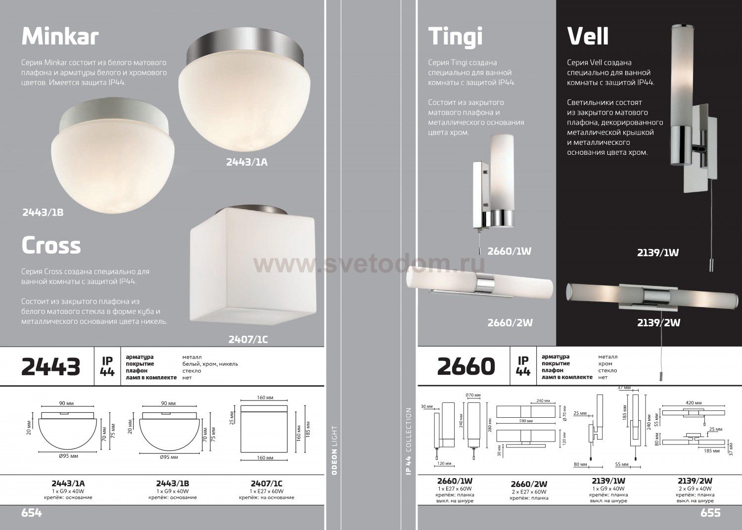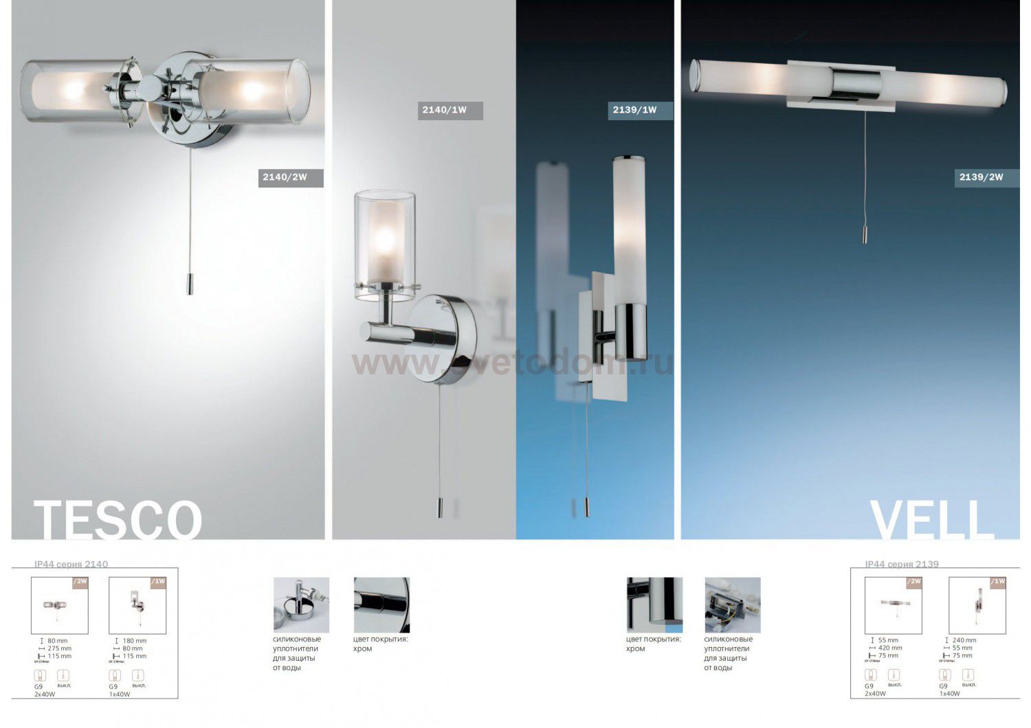 Настенный светильник 2139 / 1W линии Vell создан специально для ванной комнаты с защитой IP44. Состоит из закрытого матового плафона, декорированного металлической крышечкой сверху, и металлического основания цвета хром. Имеется выключатель. Цоколь G9. Мощность 1*40W. Нет ламп в комплекте.