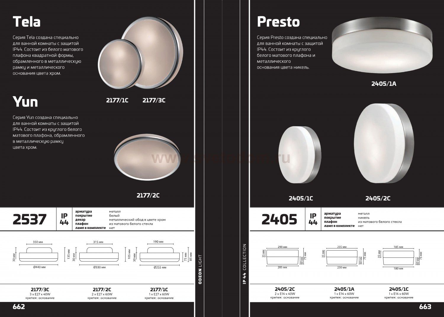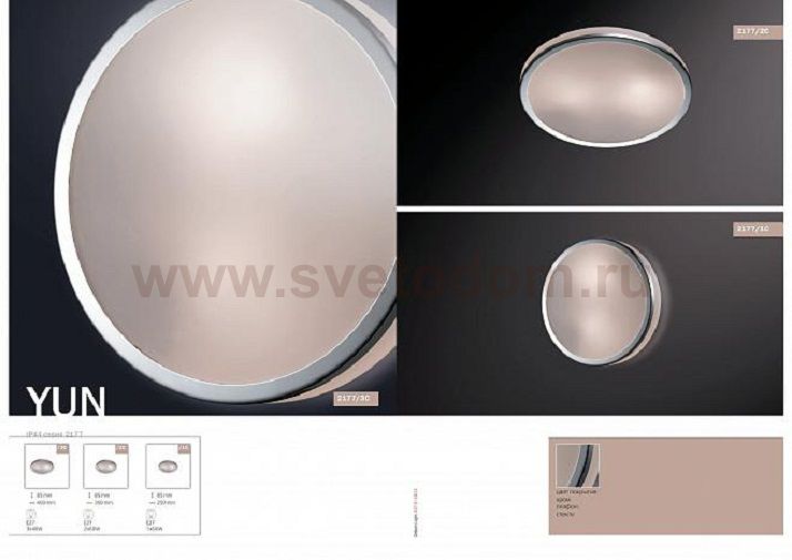 Потолочный светильник 2177/2C линии Yun создан специально для ванной комнаты с защитой IP44. Состоит из круглого белого матового плафона, обрамленного в металлическую рамку и металлического основания цвета хром. Цоколь E27. Мощность 2*60W. Нет ламп в комплекте.