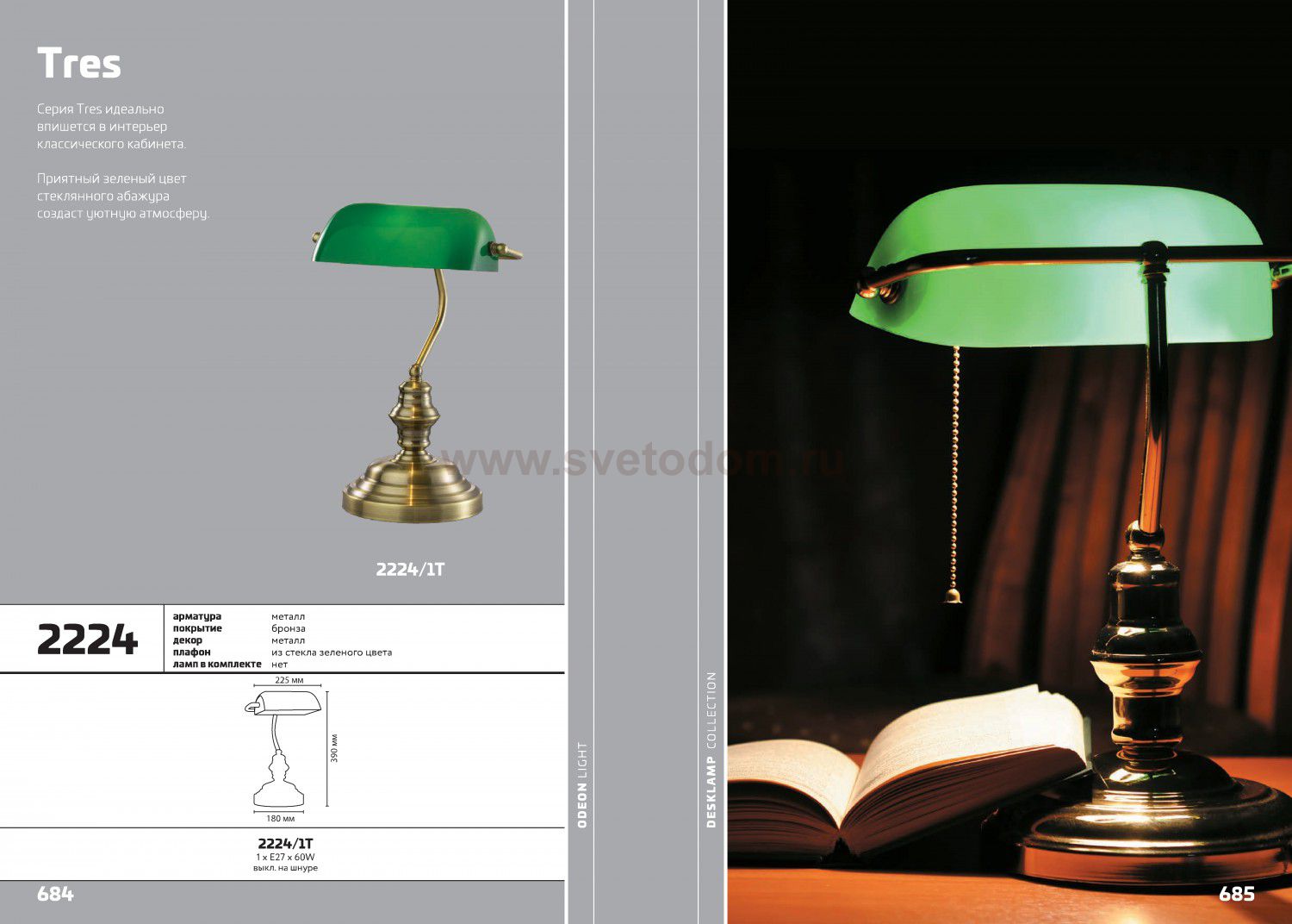Настольная лампа 2224/1T линии Tres выполнена в классическом стиле и состоит из основания цвета бронза и стеклянного плафона зеленого цвета. Цоколь E27. Мощность 1*60W.