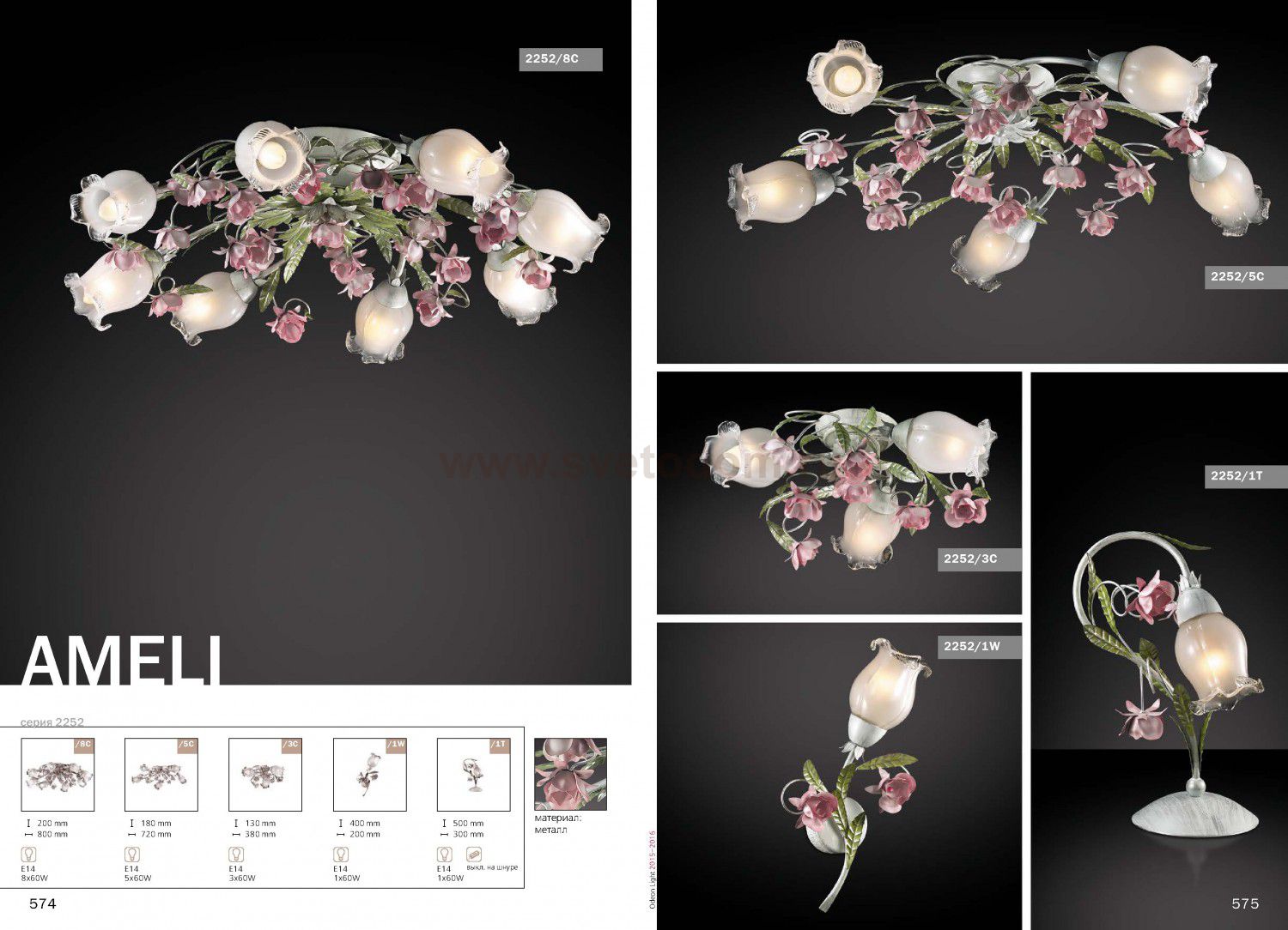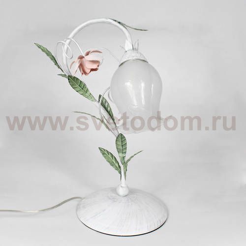 Настольная лампа 2252/1T линии Ameli украшена изящными нежными розами и зелеными лепестками, а плафон, выполненный из белого матового стекла, играет роль нераспустившегося цветочного бутона. Цоколь E14. Мощность 1*60W. Нет ламп в комплекте.