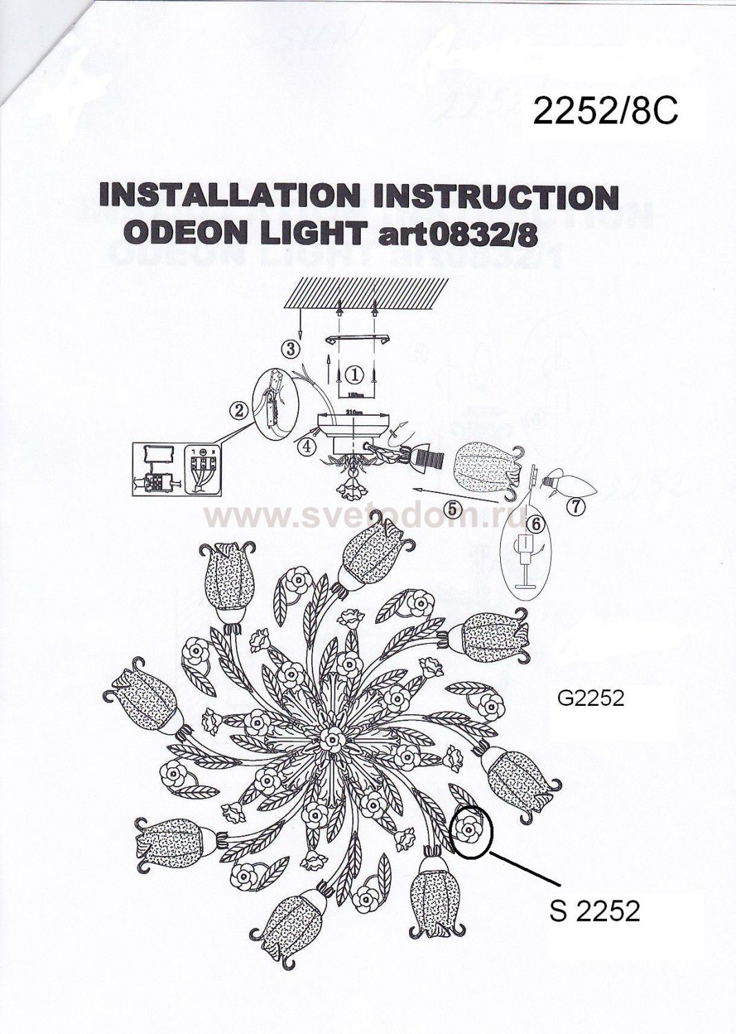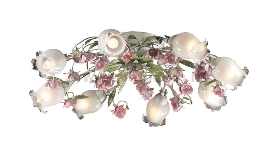 Люстра 2252/8C линии Ameli украшена изящными нежными розами и зелеными лепестками, а плафоны, выполненные из белого матового стекла, играют роль нераспустившихся цветочных бутонов. Цоколь E14. Мощность 8*60W. Нет ламп в комплекте.